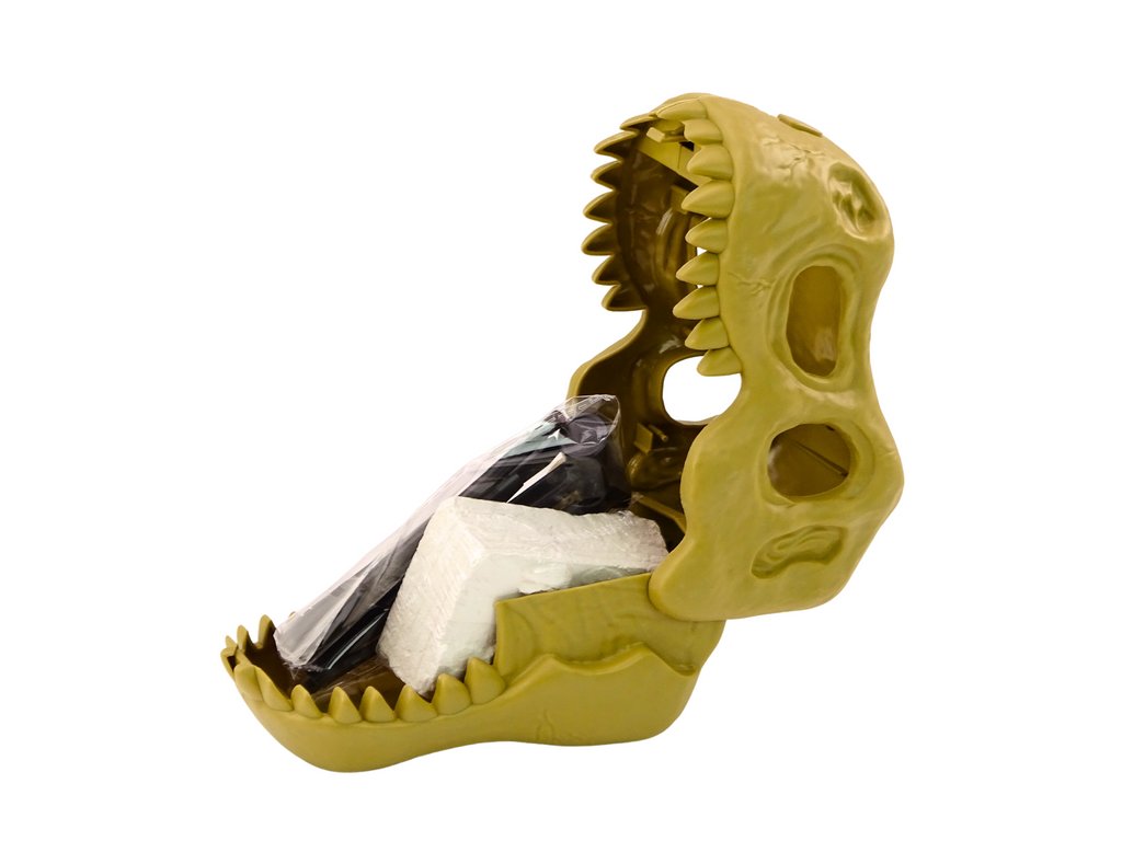 Celoten komplet je postavljen v plastično dinozavrovo lobanjo, ki ima dvojno funkcijo – praktičen prostor za shranjevanje in stilski dekorativni element, popoln za sobo mladega ljubitelja dinozavrov. Tako komplet ne le ponuja dolgotrajno zabavo, ampak služi tudi kot privlačen dekorativni kos.