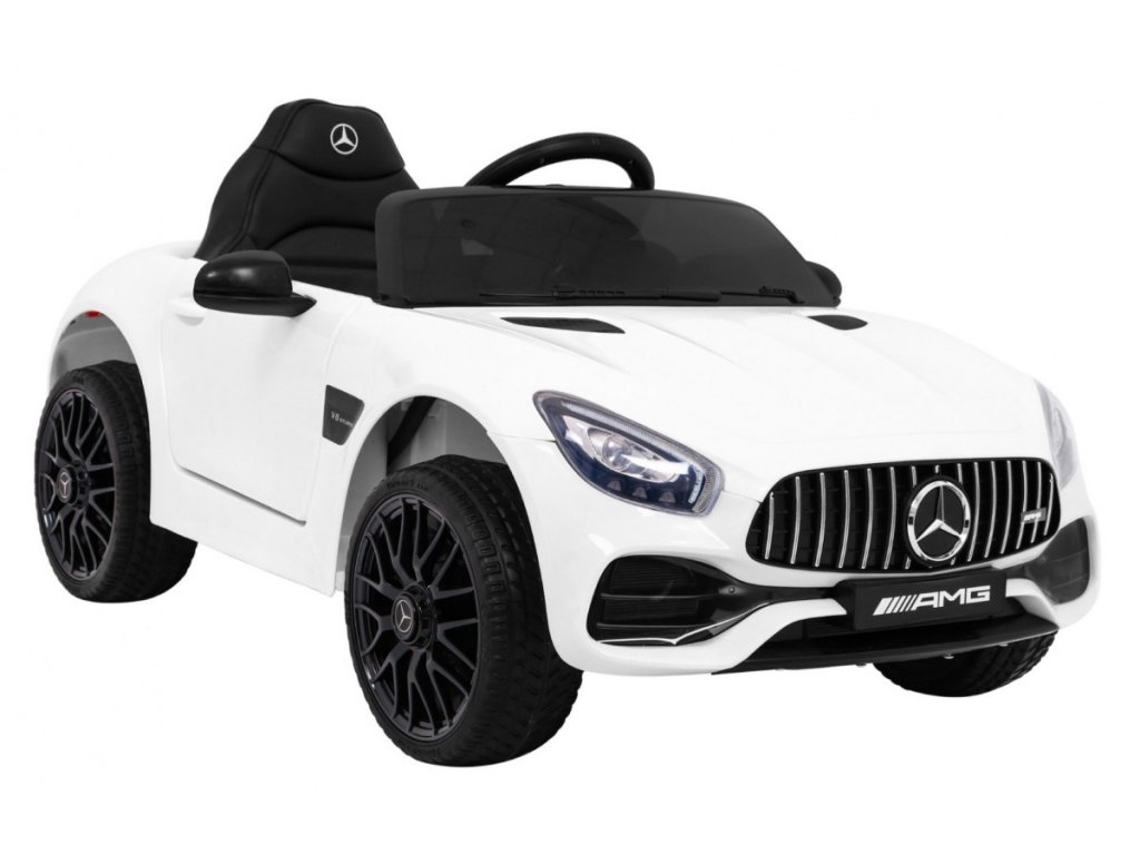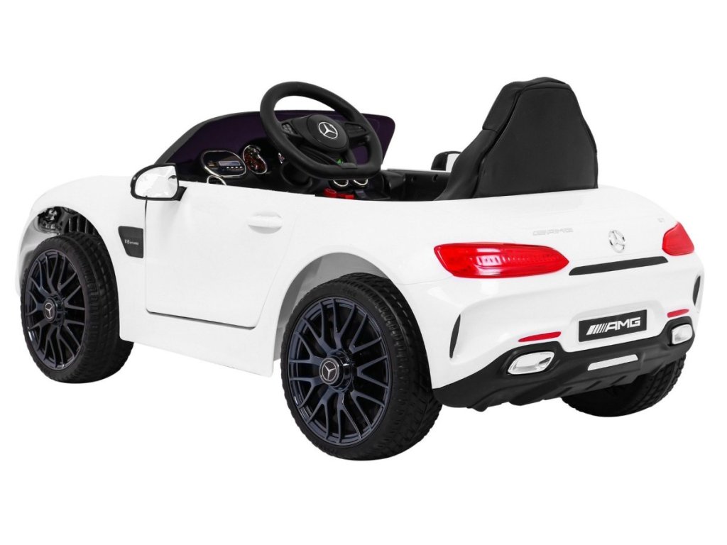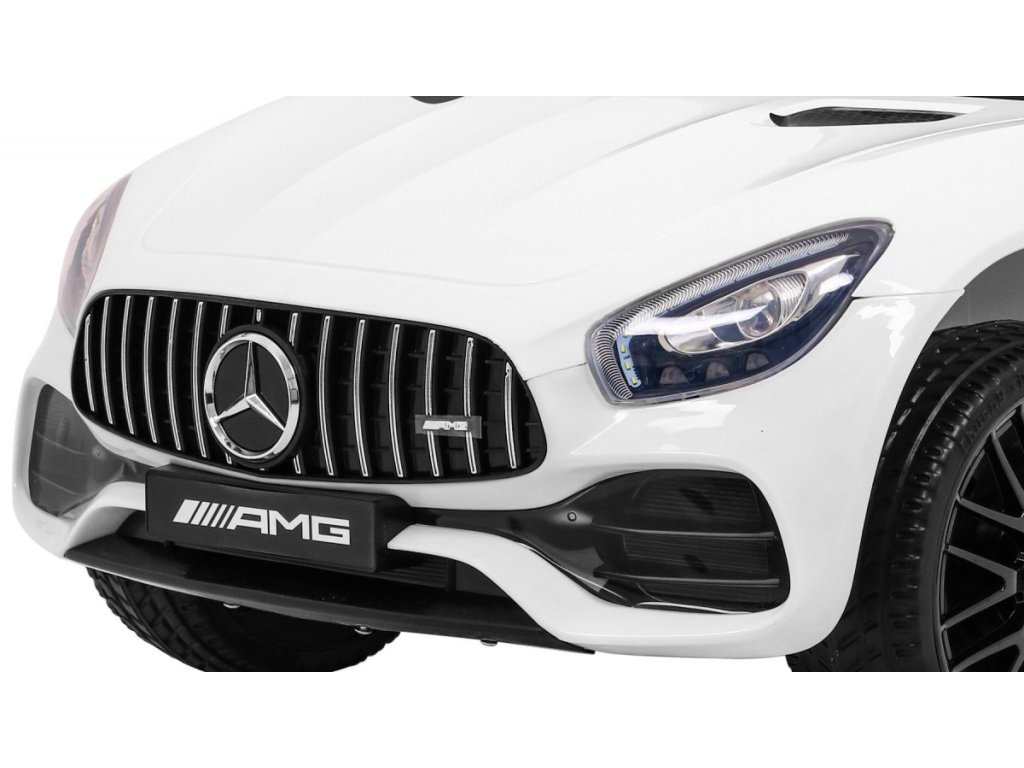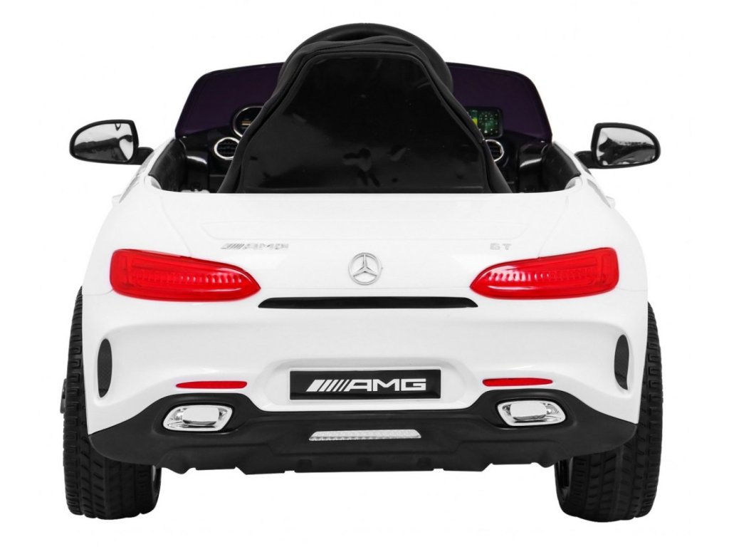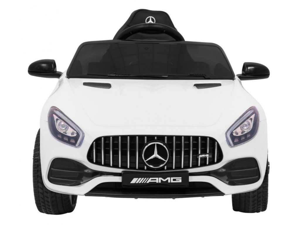 Električni avto Mercedes Benz GT v beli barvi. Električni avto je opremljen s svetlečimi sprednjimi in zadnjimi lučmi. Vsebuje priključek za MP3, SD kartico in USB. Če se želite podati na vožnjo, se le udobno usedite v električni avto in pritisnite gumb START. Komplet vključuje tudi daljinski upravljalnik za starše, ki ga lahko uporabite, ko otrok še ne obvlada same vožnje z avtom.