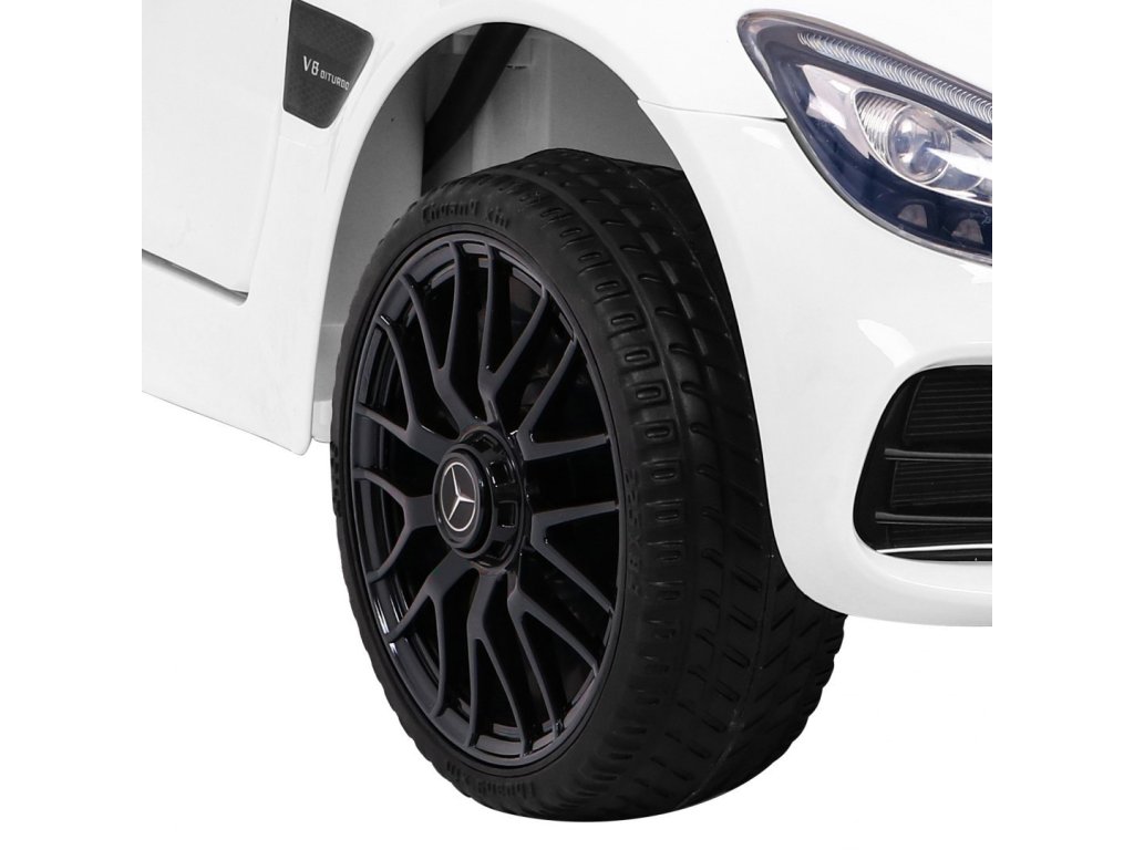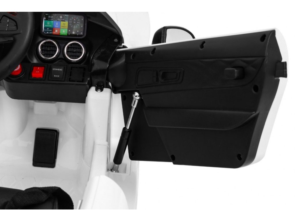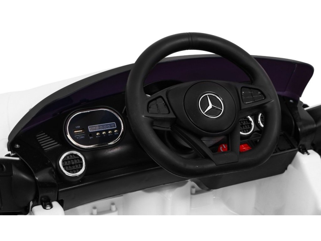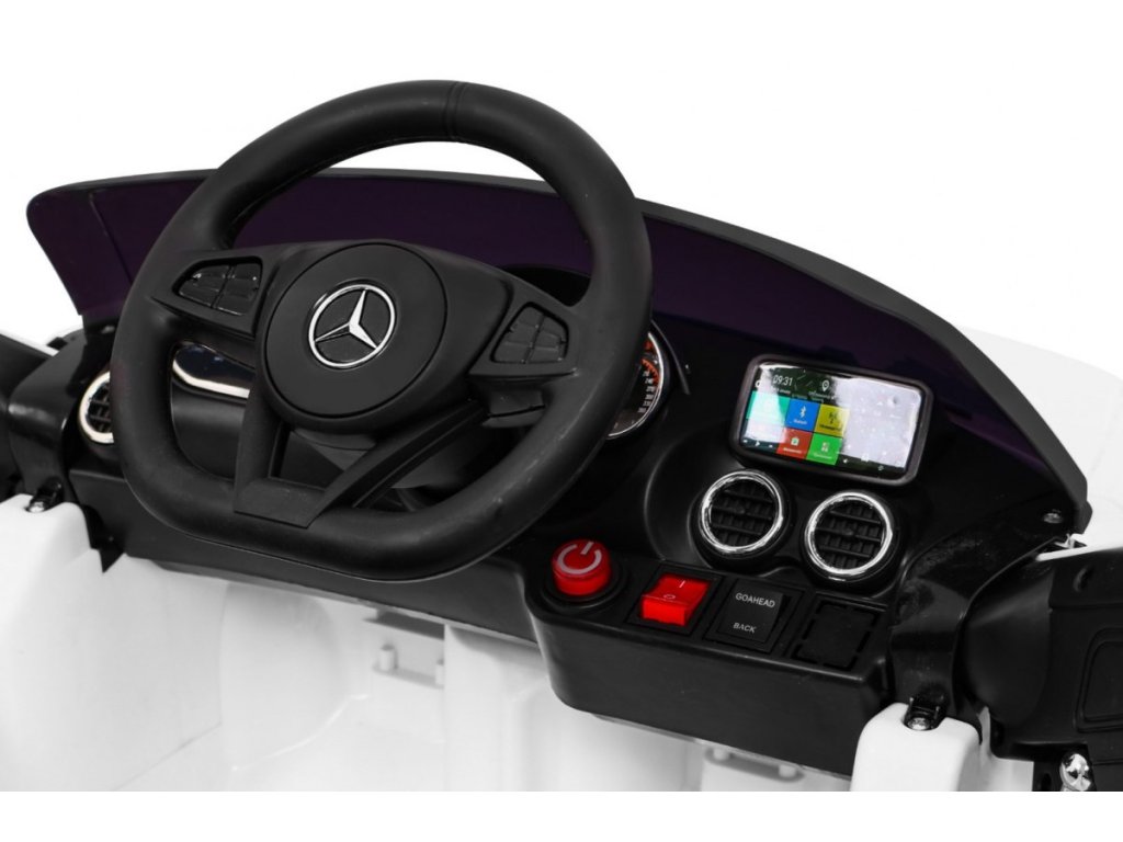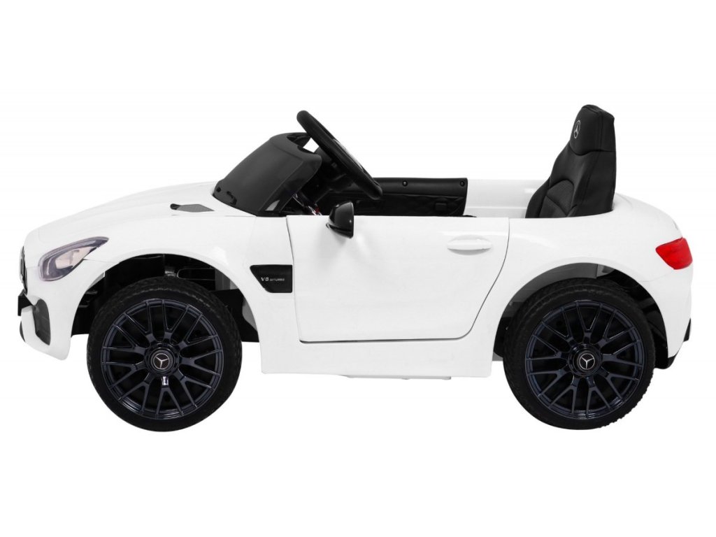 Električni avto Mercedes Benz GT v beli barvi. Električni avto je opremljen s svetlečimi sprednjimi in zadnjimi lučmi. Vsebuje priključek za MP3, SD kartico in USB. Če se želite podati na vožnjo, se le udobno usedite v električni avto in pritisnite gumb START. Komplet vključuje tudi daljinski upravljalnik za starše, ki ga lahko uporabite, ko otrok še ne obvlada same vožnje z avtom.