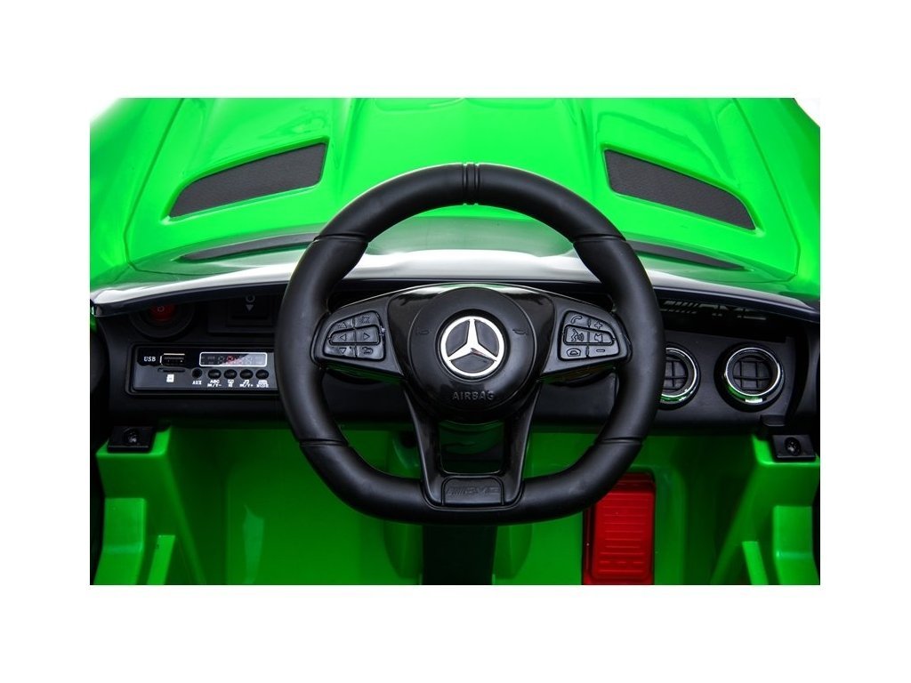 Element, ki ne sme manjkati v električnem avtomobilu, ki ga poganja baterija, je glasbeni predvajalnik. FM radio je povezan z USB-priključkom in tudi na SD kartico, kar omogoča potovanje z najljubšimi pesmimi v ozadju. Tik nad njim je stikalo, ki omogoča vklop in izklop žarometov, tako da se otrok počuti kot v pravem vozilu. Edina omejitev pred igro z zelenim vozilom Mercedes GTR je teža - maksimalna nosilnost akumulatorskega vozila je 30 kg.