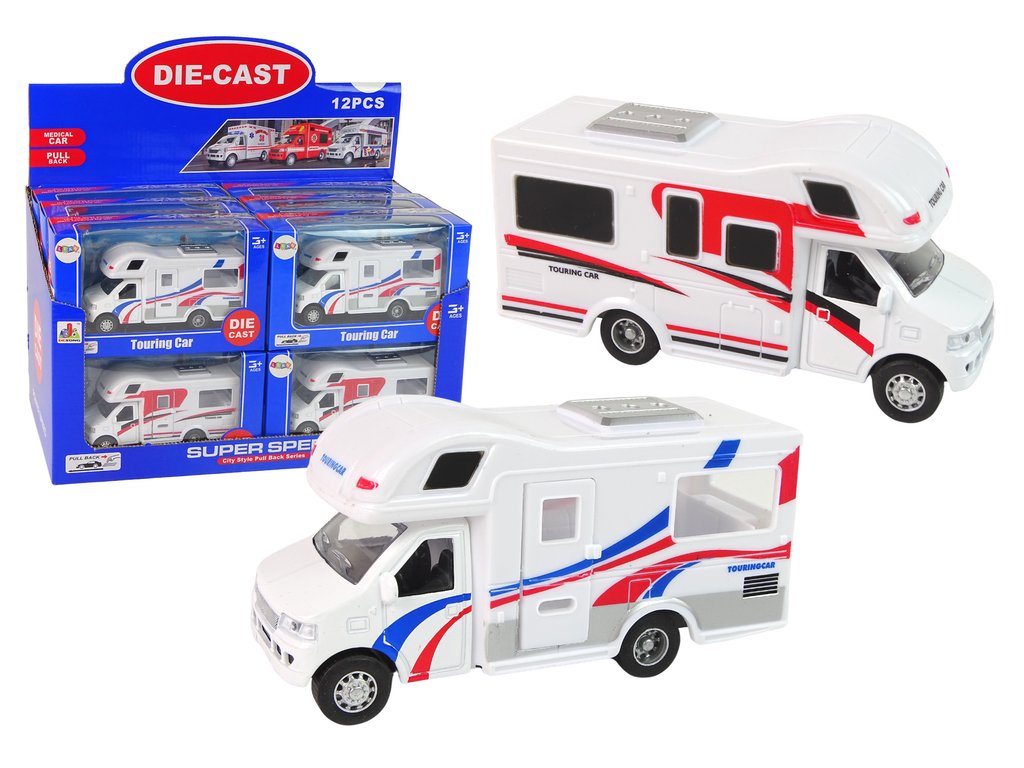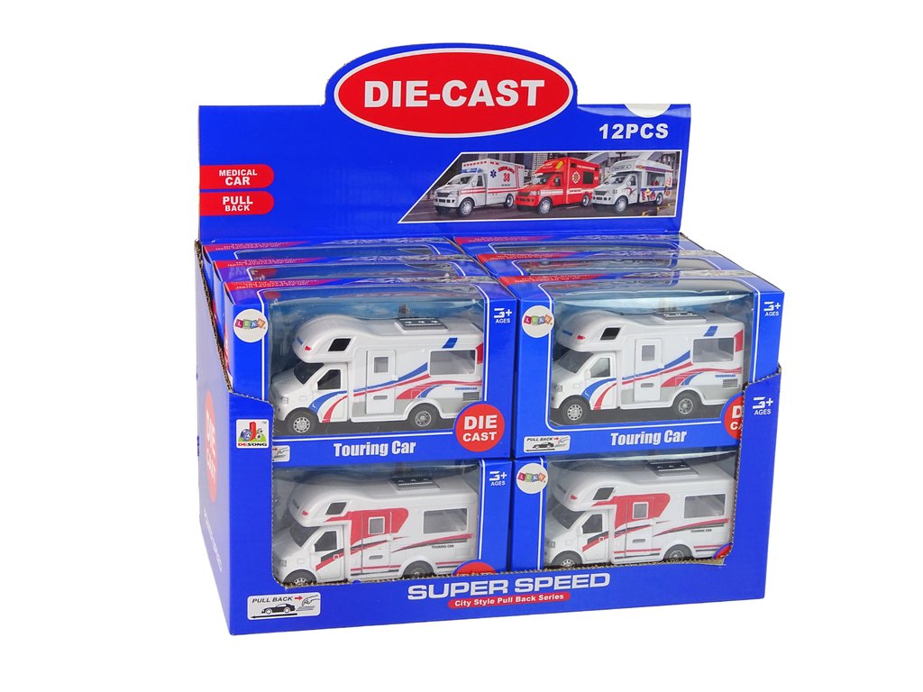 Karavan ima trenje pogon, samo potegnite in spustite in opazujte, kako drsi naprej. Notranjost je popolnoma reproducirana z vsakim detajlom, raztegljivi ležalniki, volan se ne razlikujejo od pravega nasprotnika. Poleg tega ima na eni strani odpirajoča se vrata.