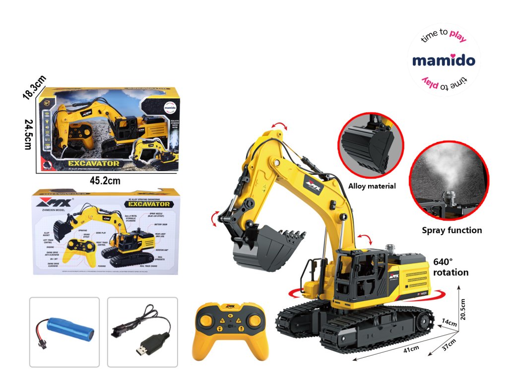 Roko je mogoče v celoti upravljati, kabina se obrača do 640°, kar omogoča avtentična gradbena dela. Upravljanje zagotavlja 2,4 GHz daljinski upravljalnik z visoko natančnostjo in brez motenj.
