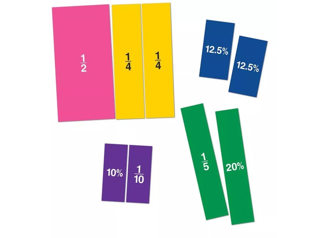 Učencem vizualizirajte, kako ulomki tvorijo dele celote. Dvostranski magnetni deli omogočajo sestavljanje delov v eno celoto in primerjavo ulomkov z ustreznimi odstotki.