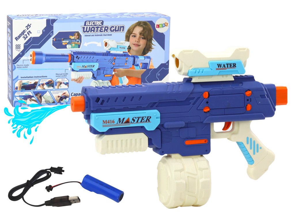 Električna vodna pištola M416! Z impresivno podobo v odtenkih modre in bele z oranžnimi poudarki je ta futuristična mitraljeza popoln spremljevalec poletnih dogodivščin za otroke in odrasle.