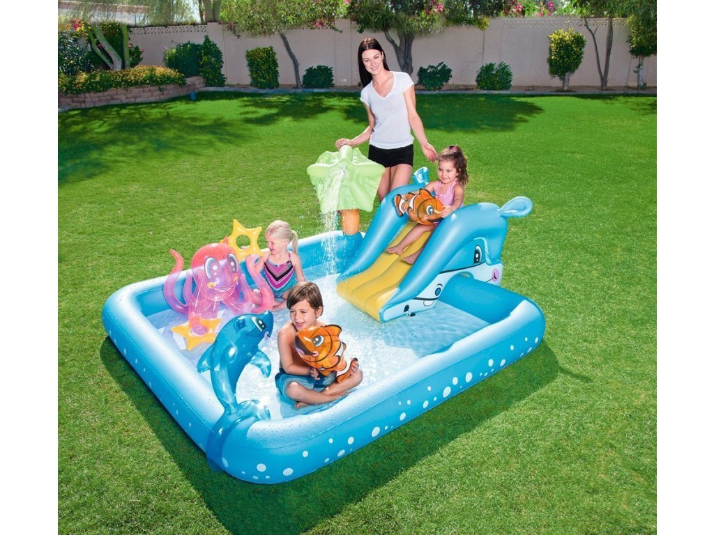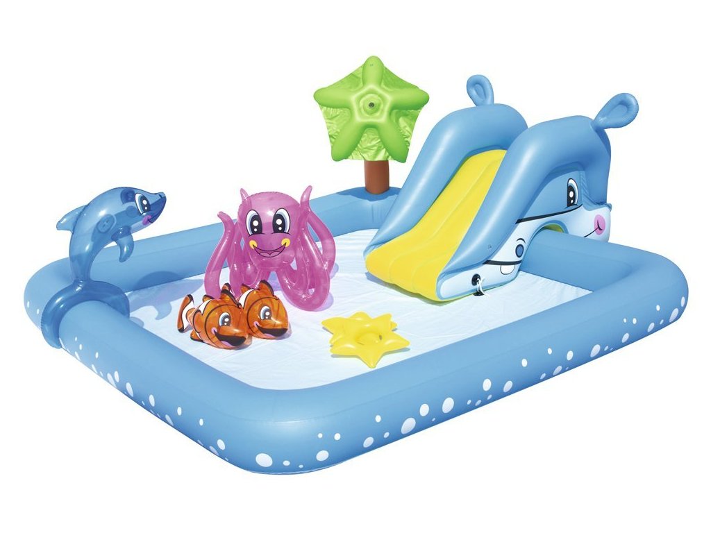 Želite svojemu otroku omogočiti nepozabno zabavo v udobju vašega vrta? Nafukljiv bazen - igralno igrišče iz njega naredi pravo igralno središče za vašega otroka. Bazen z napihljivimi prebivalci oceana, napihljivo toboganom in vodnjakom bo zagotovo navdušil vašega malčka in postal njegovo najljubše mesto za igro. Bazen je izdelan iz mehkega, a trpežnega materiala in je kar najsodobnejši za najmlajše otroke. Glavne atrakcije so: odstranljiv napihljiv tobogan in palma, iz katere bo ob priklopu na vrtno cev pritekla voda.