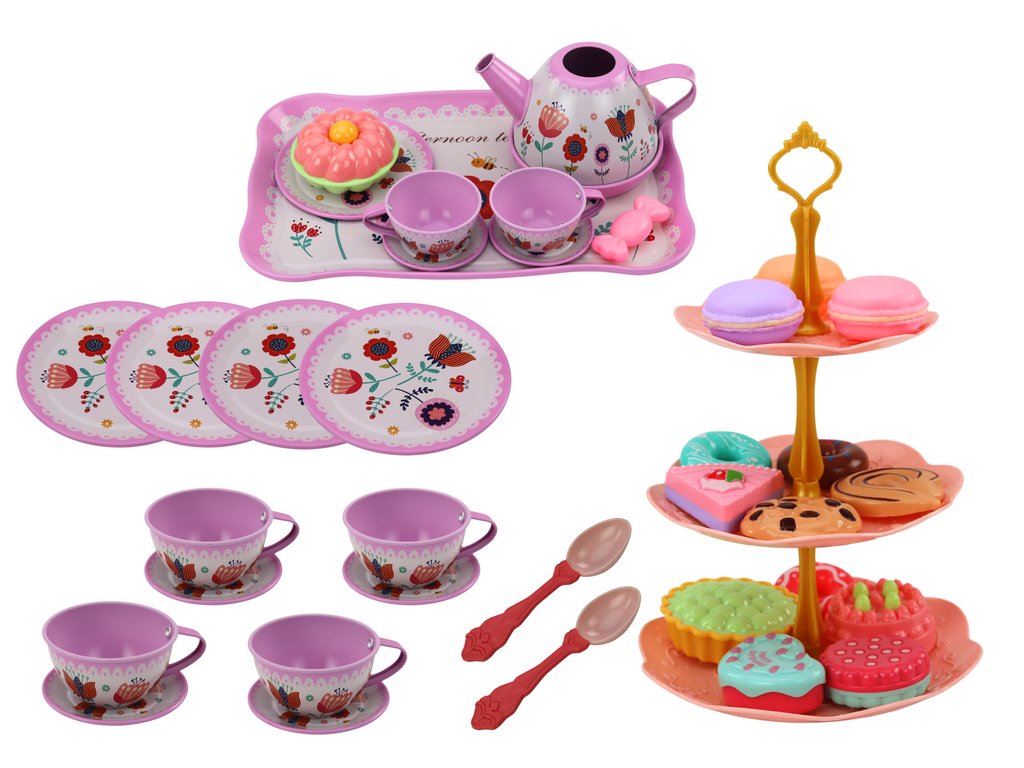 V kovčku najdete vse, kar je potrebno za organizacijo nepozabnega čajnega večera. Set vključuje majhne in večje krožnike, prikupen čajnik, skodelice, pladenj, etažo za piškote in različne privlačne piškote. Vsak element je skrbno izdelan, njihova barvitost in vzorci pa so zelo privlačni za otroke, spodbujajo jih k ustvarjalni igri.