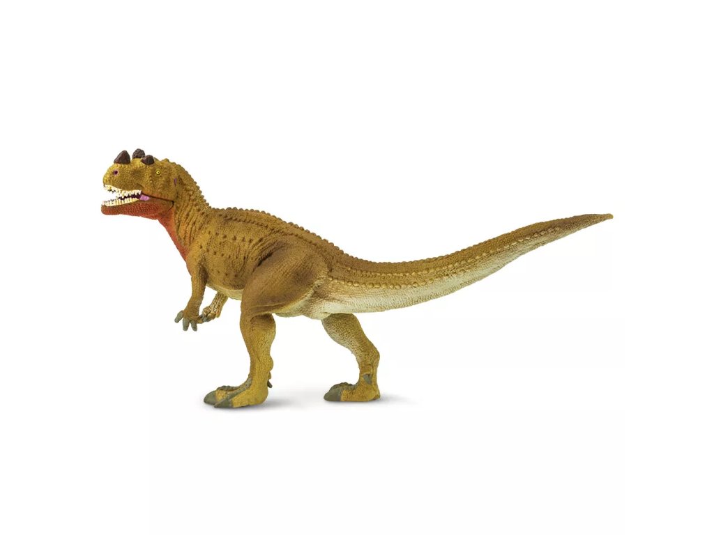Figura prikazuje mesojedega dinozavra z rumenimi očmi in značilnim kostnim grebenastim izrastkom. Model je profesionalno oblikovan in ročno poslikan, s poudarkom na natančni obdelavi površine.