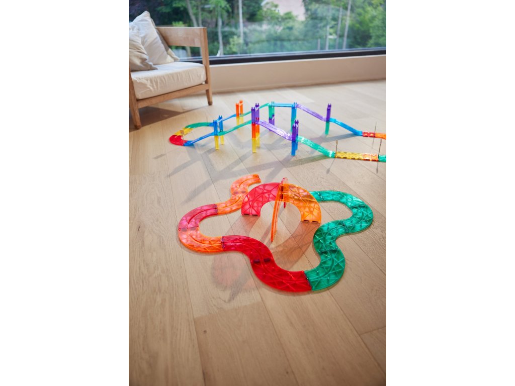 Rozšiřte svou závodní dráhu Cleverclixx o další možnost stavby s touto praktickou sadou Zatáčky k závodní dráze. Obsahuje 15 speciálně tvarovaných magnetických dílků v 3 různých barvách, které umožňují vytvářet plynulé oblouky a rozmanité zatáčky. Díky tomu můžete navazovat na základní 65dílnou sadu a stavět delší, propracovanější a zábavnější dráhy.