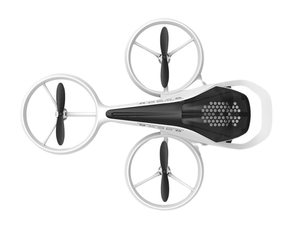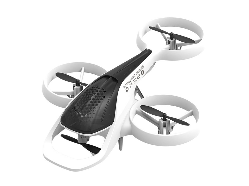 Ta neverjeten dron v beli barvi s tremi propelerji.