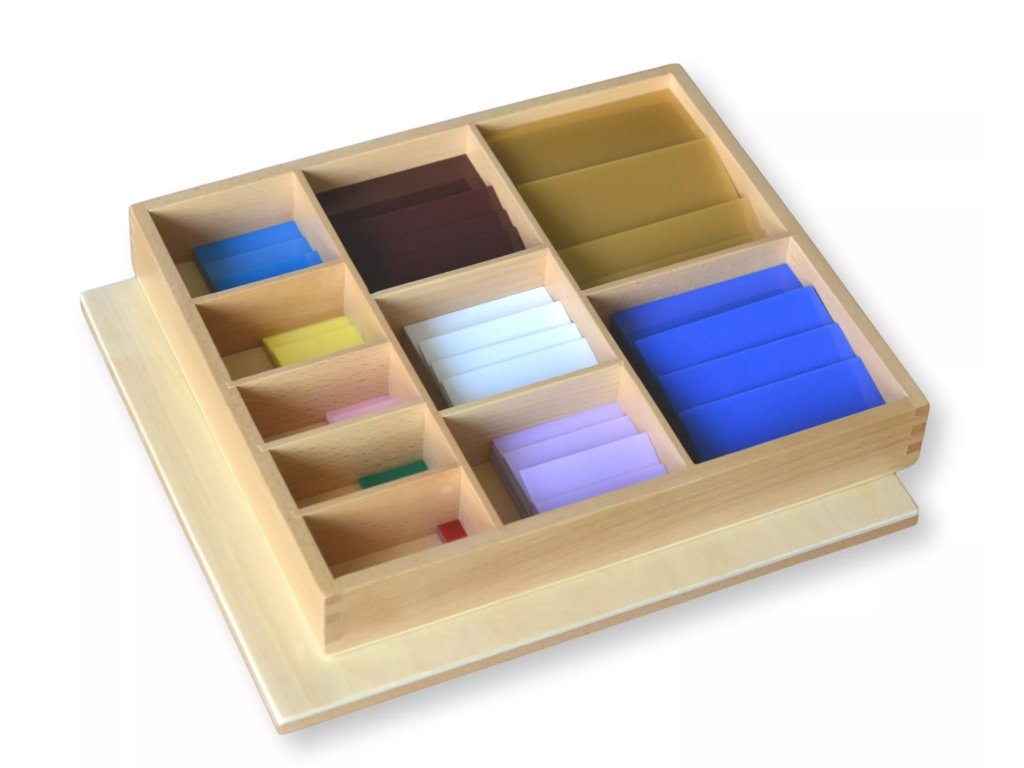 Material vsebuje škatlo z desetimi predelki za barvne kvadrate in pravokotnike. Oblike so barvno ločene in različnih velikosti.