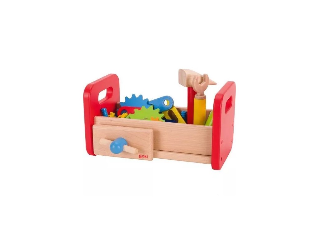 Delovna miza in komplet lesenega orodja za otroke, ki združuje zabavo z razvojem praktičnih spretnosti.