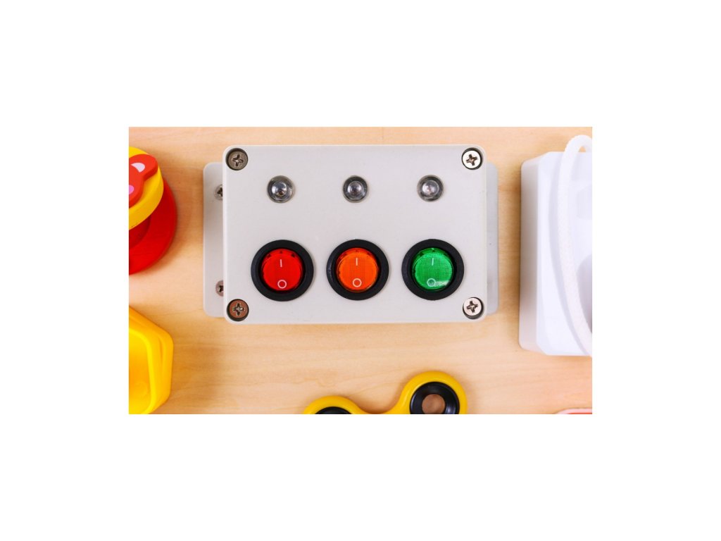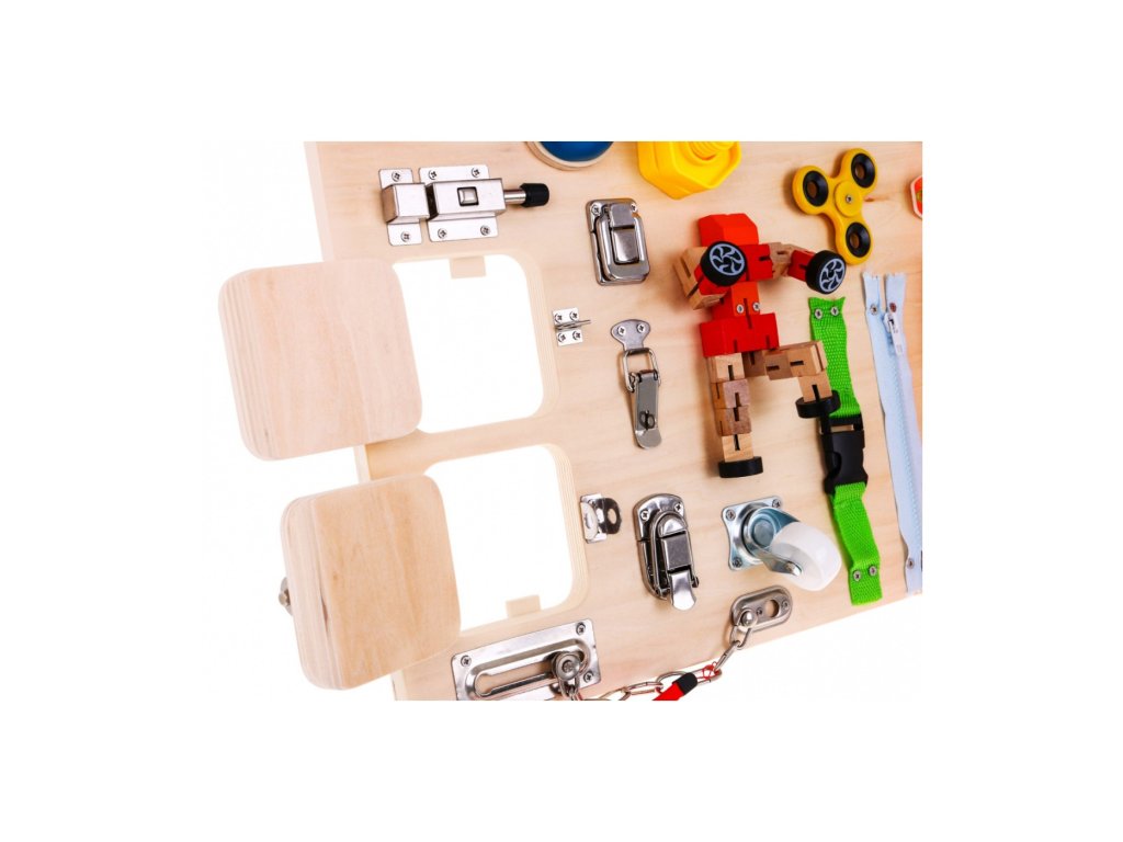 Didaktična senzorna deska je večnamenska igrača, namenjena otrokom od 3. leta starosti. Set sestavlja deska s pritrjenimi elementi, s katerimi se otrok srečuje v vsakdanjem življenju. Skozi igro otrok razvija veščine na področju fine motorike, logičnega mišljenja in analize vzrokov in posledic. Deska ima zvočne in svetlobne elemente na upravljalniku. Set napajata 2 x AA bateriji, ki nista priloženi.