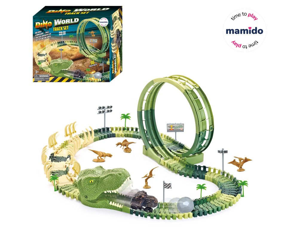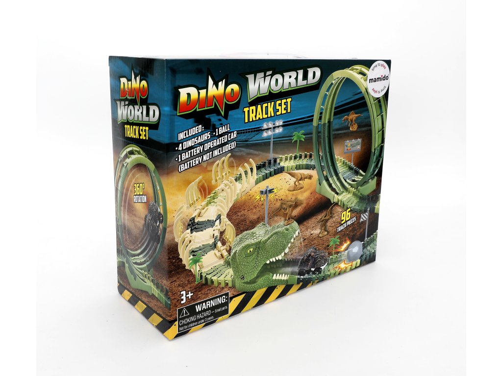 Domiselnost v prazgodovini oživi. Komplet Dino World ponuja prožno dirkalno stezo z upogljivimi deli, velikim zvezdnim krogom, vrati v obliki glave dinozavra in dodatki za ustvarjanje lastnih prog. Vključenih je tudi 4 dinozavri – idealno za otroški svet pustolovščin. Avto se po progi vozi sam (napajanje na baterije).
