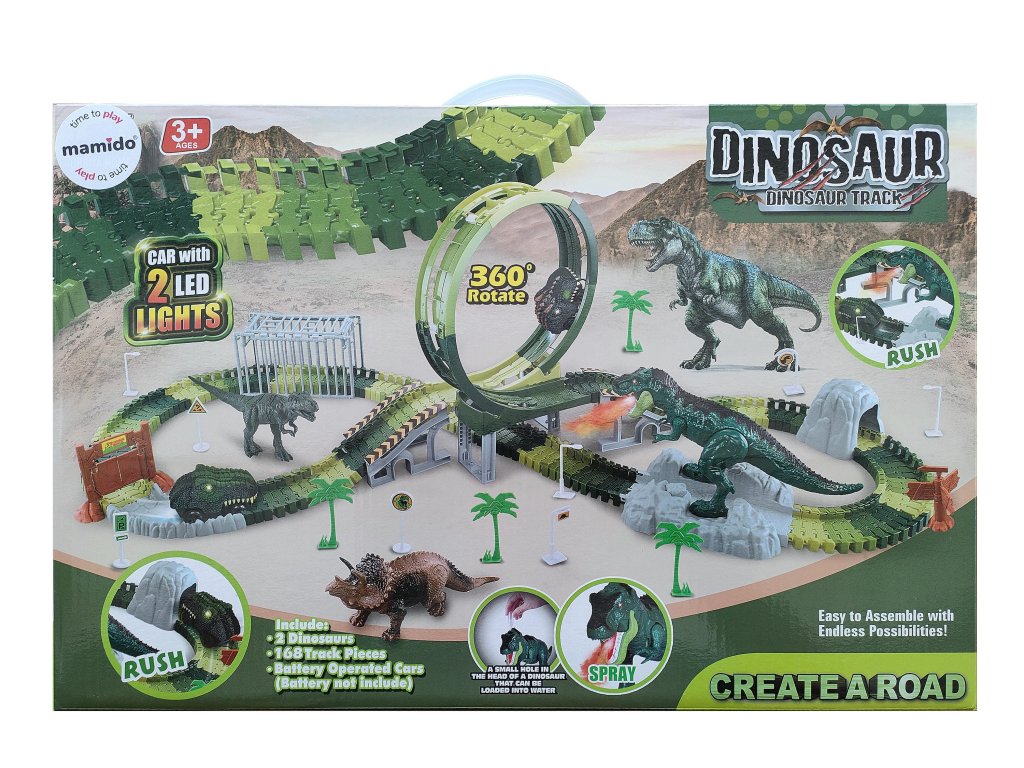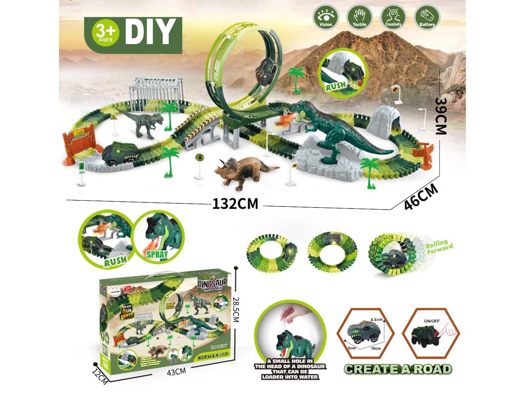 Pustolovna dinosaurja pro dirkalne steze bo otroke popeljala v prazgodovino, polno napetosti in zabave. Komplet vsebuje 168 delov steze, avto z LED lučmi, zanko 360° in tudi figurice dinozavrov za ustvarjanje realističnega okolja. Stezo je mogoče poljubno sestavljati in spreminjati njeno obliko, kar spodbuja otroško ustvarjalnost. Pole enega izmed dinozavrov ima funkcijo pršenja pare, kar igri dodaja še večji učinek.