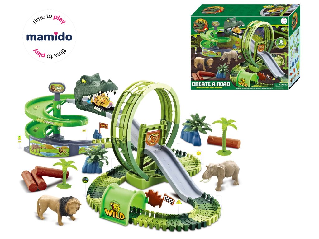 Pustolovni svet dinozavrov oživi – velika sestavljanka dirkalne steze z akcijskimi elementi, 360° zanko in LED avtomobilom, ki se pelje skozi vrata neposredno skozi čeljust dinozavra. Zahvaljujoč prožnim členom lahko stezo enostavno oblikujete v ovinke, skoke in ovire. Vključuje tudi stolp s kletko za "ujetje" dinozavrov in 5 dinozavrov za še večje doživetje igre.
