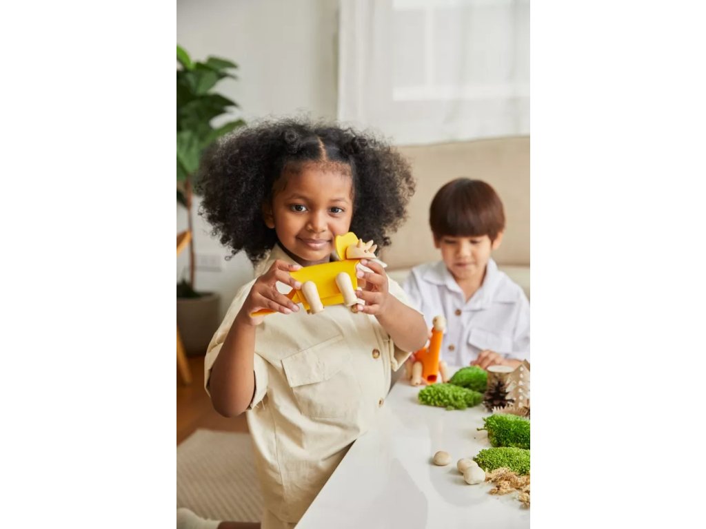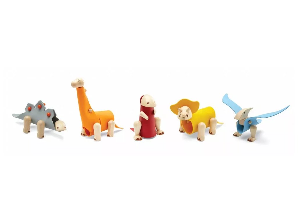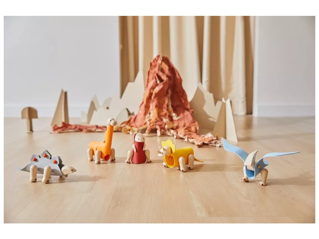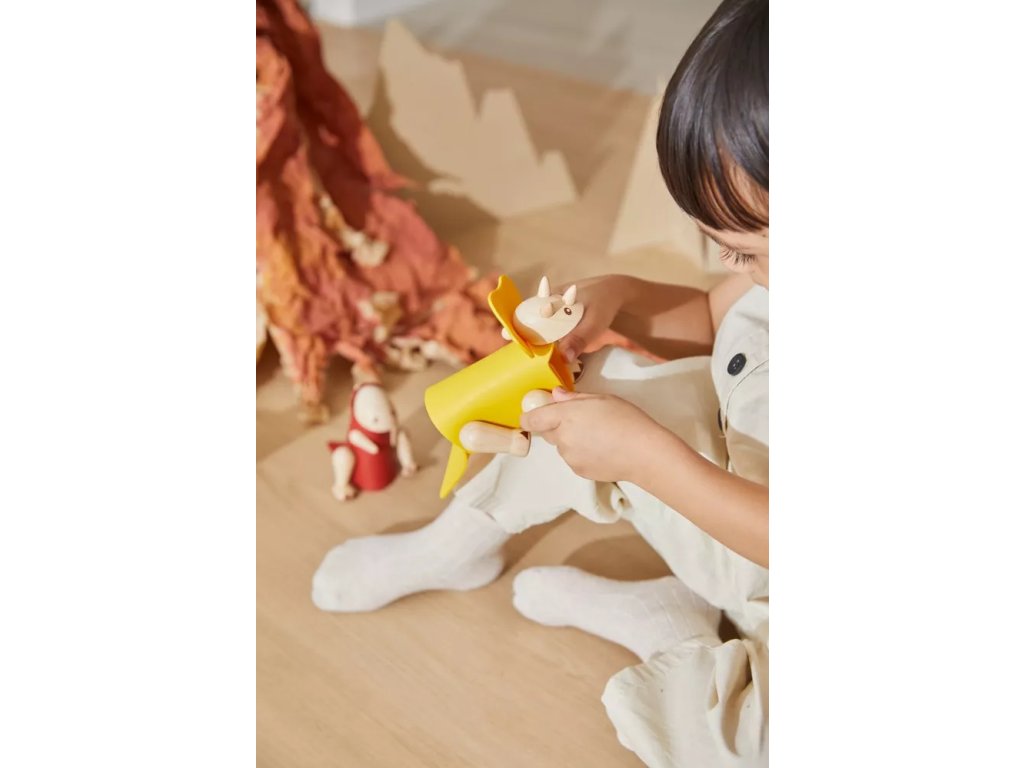 Preoblikovalna lesena igrača Triceratops, ki jo sestavlja kombinacija lesenih in gumijastih delov. Dopolnimo jo lahko z materiali po lastni domišljiji; del kompleta je tudi kartica, ki povezuje učenje in igro.