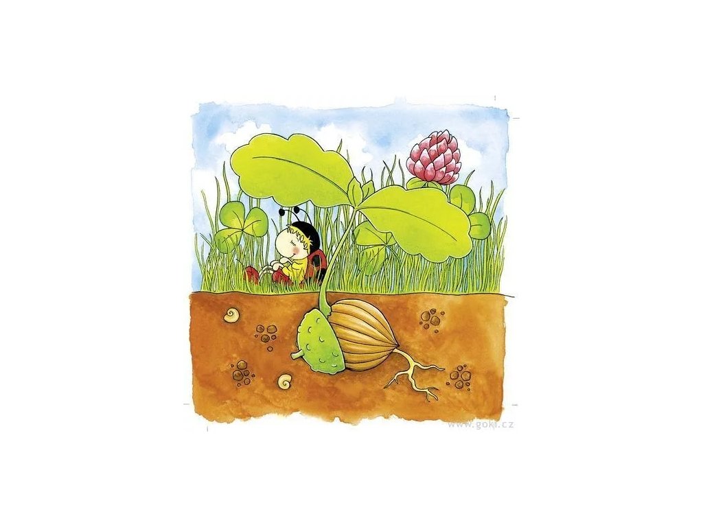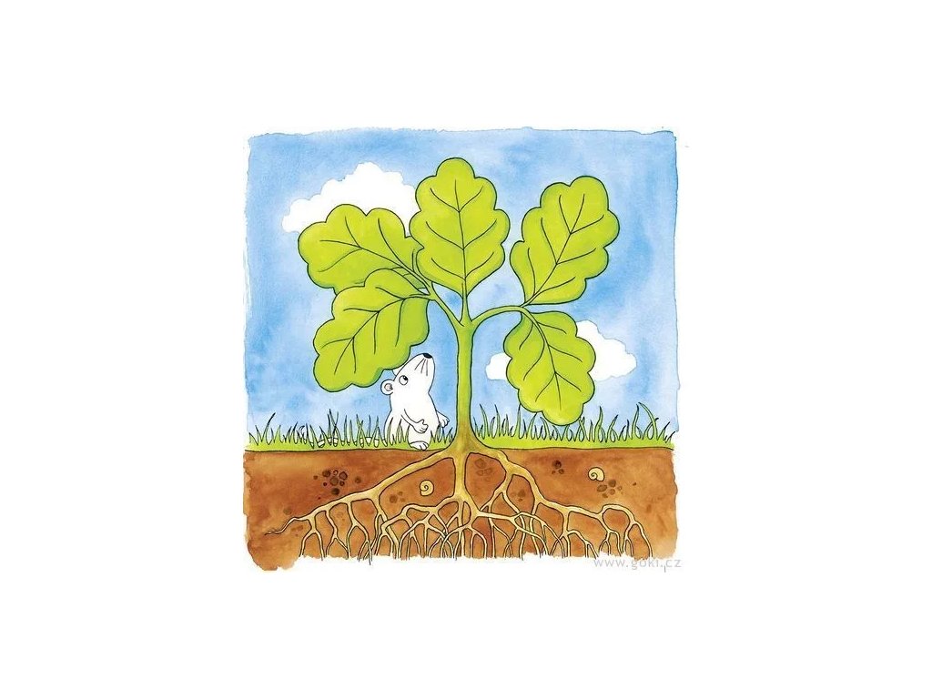 Sestavljanka prikazuje razvoj hrasta od kalitve želoda do drevesa s krošnjo, ki rodi želode. V prvih fazah je rastlinica zelo majhna in poleg nje se prilegajo drobni hroščki ali pa jo presega cvet detelje. Postopoma prerašča okoliške rastline in živali.