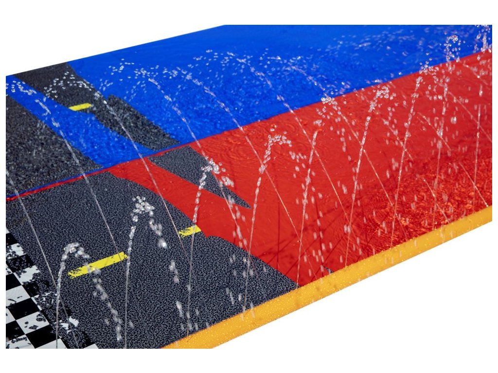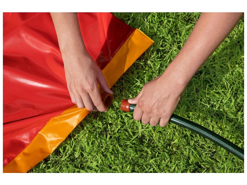 Preprosto razgrnite tobogan, ga pritrdite na tla in priključite vrtno cev. Zaradi posebnih varnostnih elementov, ki so del kompleta, se tobogan ne bo premikal. Komplet vključuje štiri obroče, ki bodo otrokom ponudili dodatno zabavo in tekmovalnost. Zmaga tisti, ki prvi prispe na cilj in uspe vrgati vse obroče na ustrezen stojan.