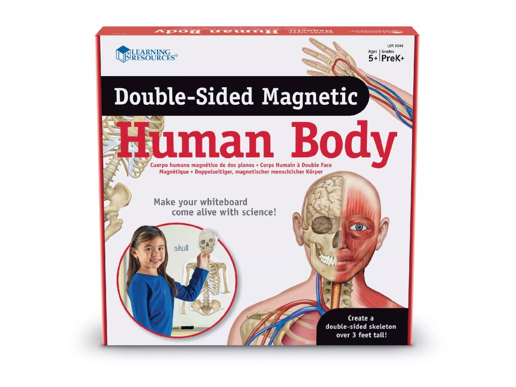Magnetni pripomoček dvostransko prikazuje človeško telo: na eni strani mišično maso in glavne organe, na drugi strani okostje. Dele je mogoče sestaviti kot sestavljanko, kar spodbuja razumevanje in zapomnitev posameznih delov telesa.