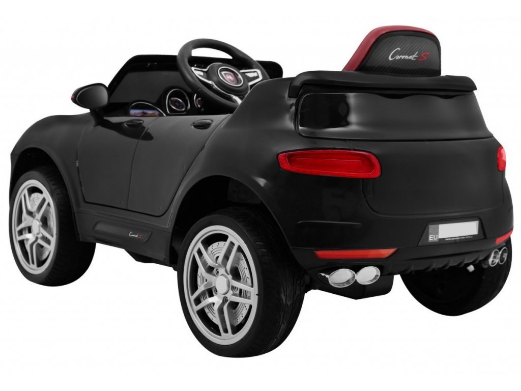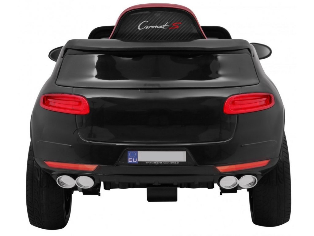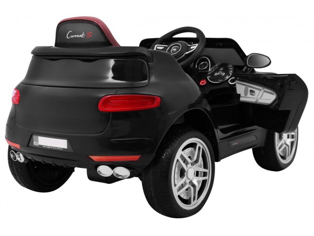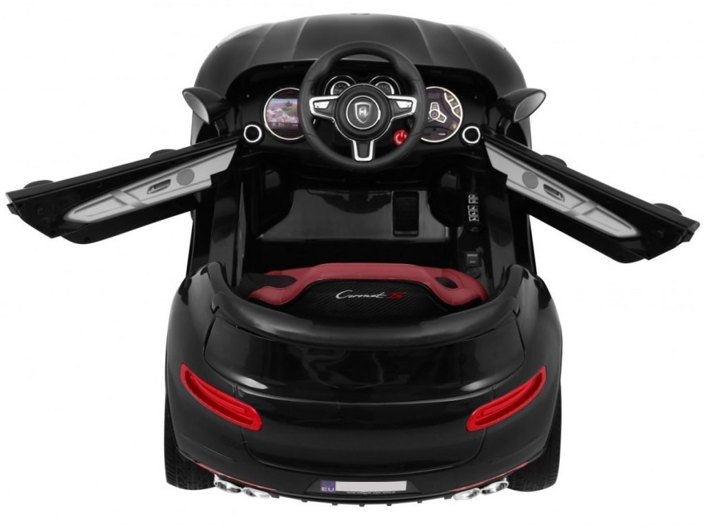 Otroški električni avto Turbo-S v črni barvi. Električni avto je opremljen s sprednjimi in zadnjimi lučmi, ki svetijo. Vsebuje priključek za MP3, SD kartico in USB. Za varnost otroka je na sedežu nameščen varnostni pas. Če se želite odpraviti na vožnjo, se le udobno namestite v električni avto in pritisnite gumb START. V kompletu je tudi daljinski upravljalnik za starše, ki ga boste uporabili, ko otrok še ne bo zmogel sam voziti avtomobila.