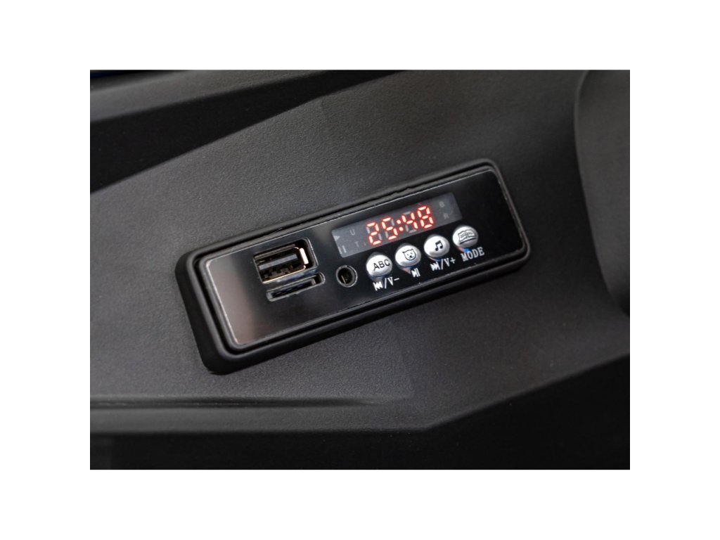 Bogata oprema vključuje sprednje in zadnje LED luči ter glasbeno ploščo z radiem in vhodi za MP3, USB, AUX in SD. Igrača avtomobilček ima vnaprej posnete melodije in hupo.
