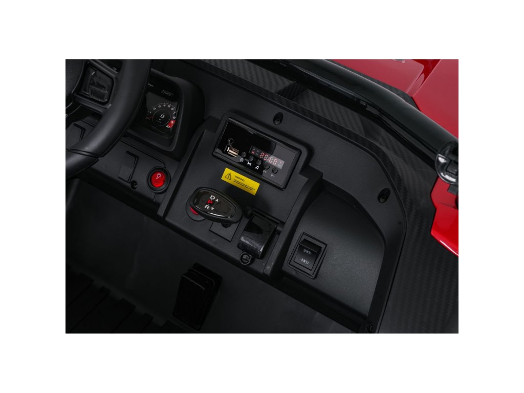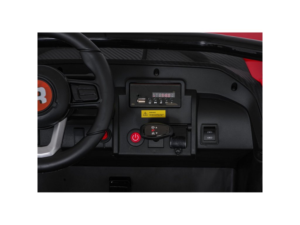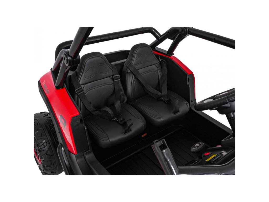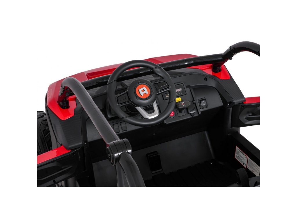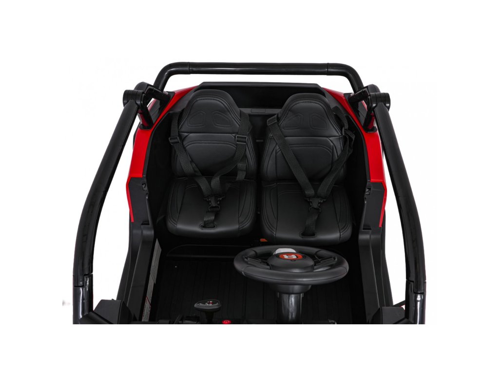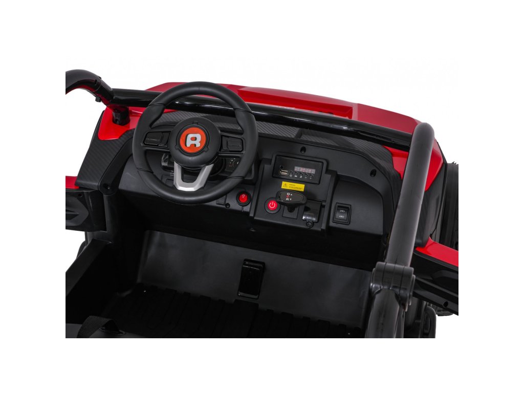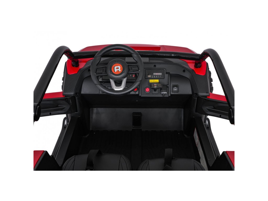 Dva ločena sedeža iz eko usnja sta opremljena z varnostnimi pasovi in omogočata hkratno vožnjo dveh otrok. Odpirajoča se vrata z varnostnimi ključavnicami zagotavljajo enostavno in varno vstopanje. LED luči spredaj in zadaj , realistični zvoki motorja in drugi zvočni učinki prinašajo pristno vozniško izkušnjo. Multimedijska plošča omogoča povezave prek USB, AUX in MP3, na voljo pa sta tudi FM radio in gumbi za upravljanje na volanu.