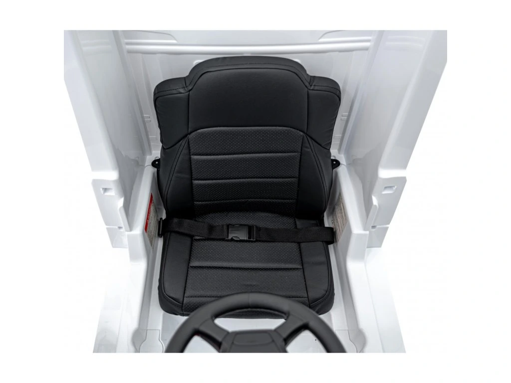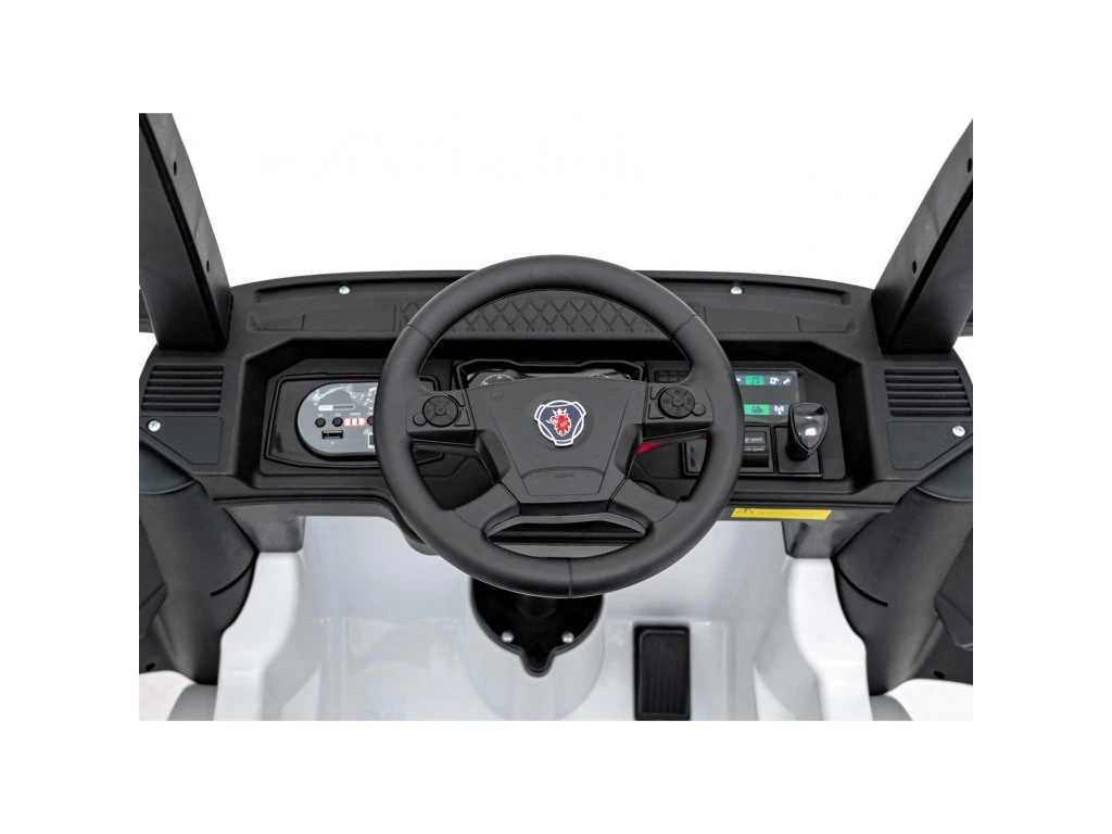 V notranjosti vas čaka udoben sedež, oblečen v eko usnje , opremljen z varnostnimi pasovi . Vaš otrok lahko uživa v zabavi zahvaljujoč vgrajenemu predvajalniku MP3 z Bluetoothom, vhodom USB , zvočnimi učinki in gumbi za hupo neposredno na volanu. Obstajajo melodije, realistični zvoki zagona motorja in indikator stanja baterije .