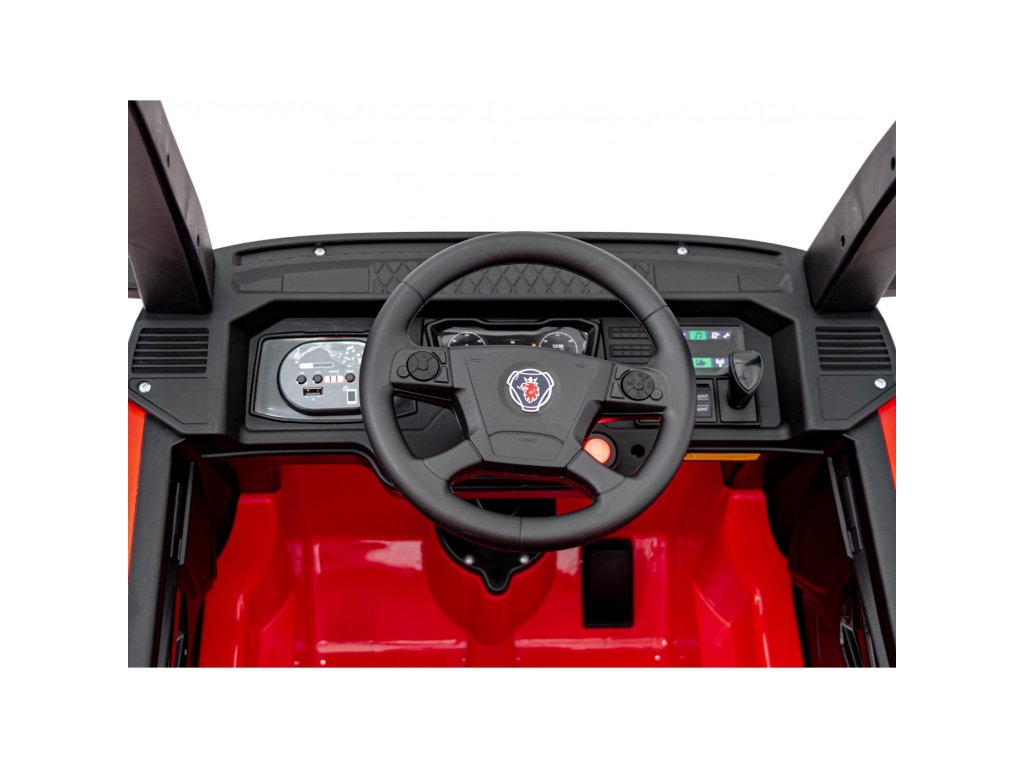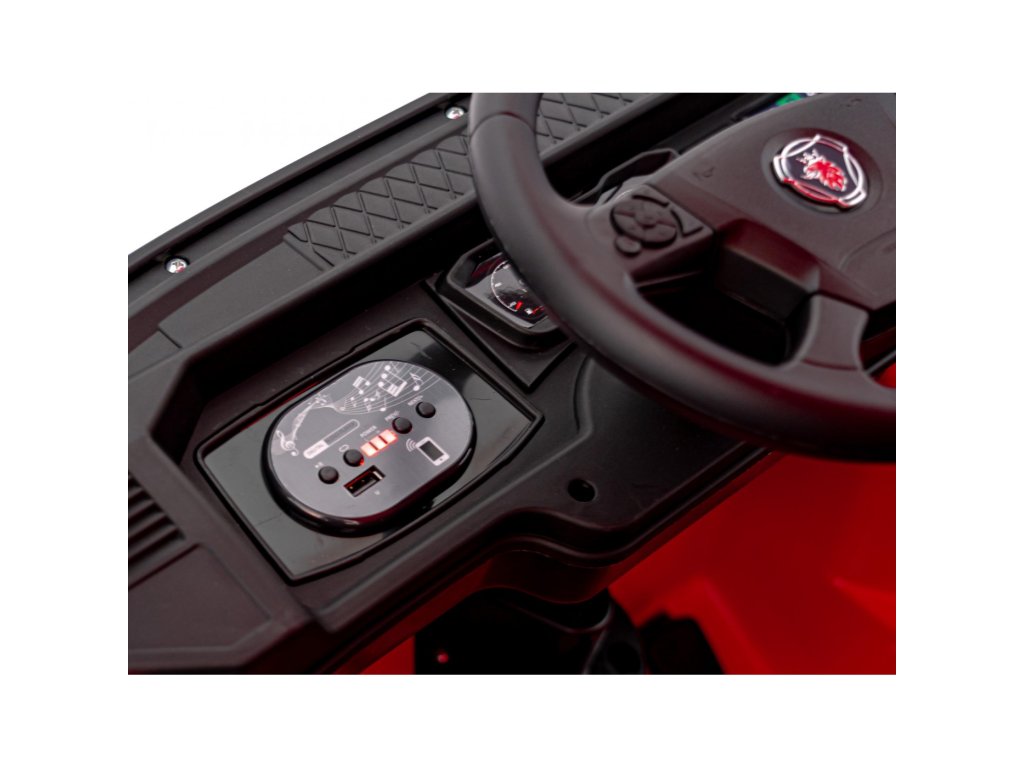 V notranjosti vas čaka udoben sedež, oblečen v eko usnje , opremljen z varnostnimi pasovi . Vaš otrok lahko uživa v zabavi zahvaljujoč vgrajenemu predvajalniku MP3 z Bluetoothom, vhodom USB , zvočnimi učinki in gumbi za hupo neposredno na volanu. Obstajajo melodije, realistični zvoki zagona motorja in indikator stanja baterije .