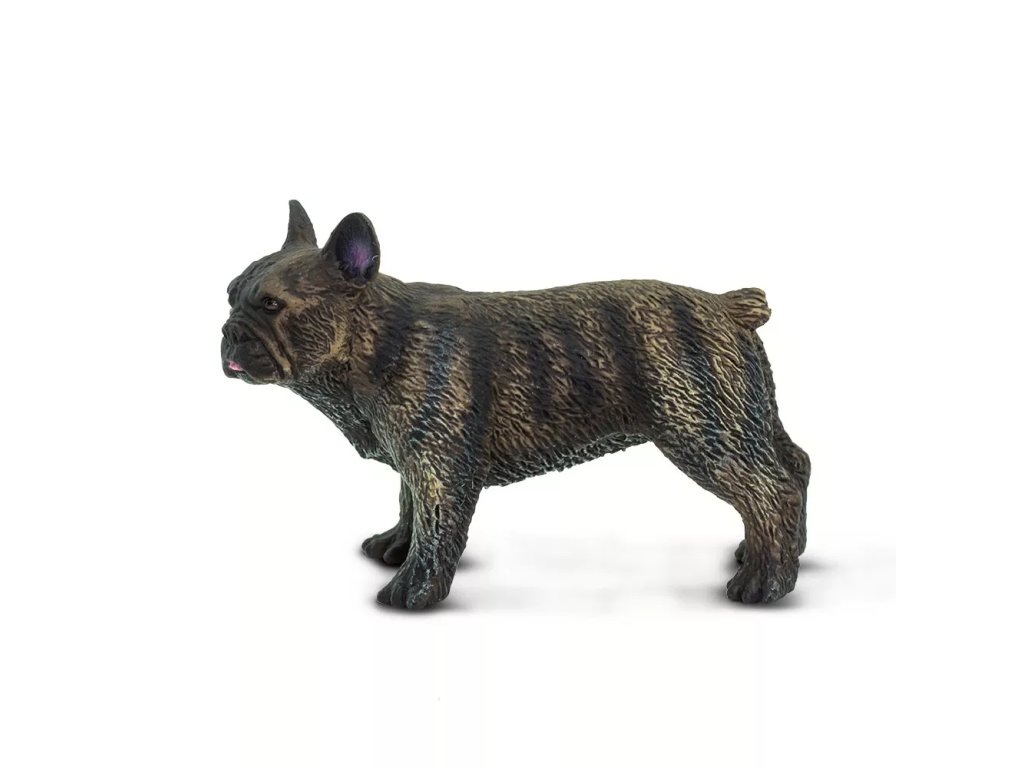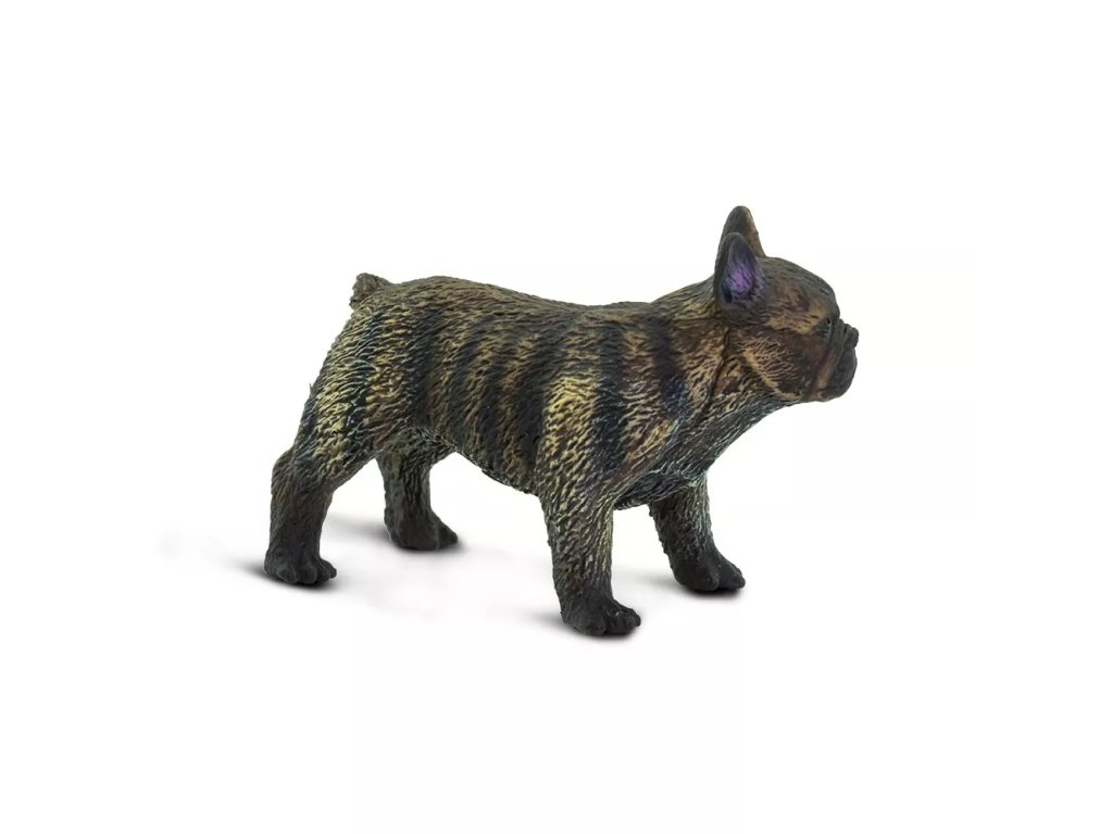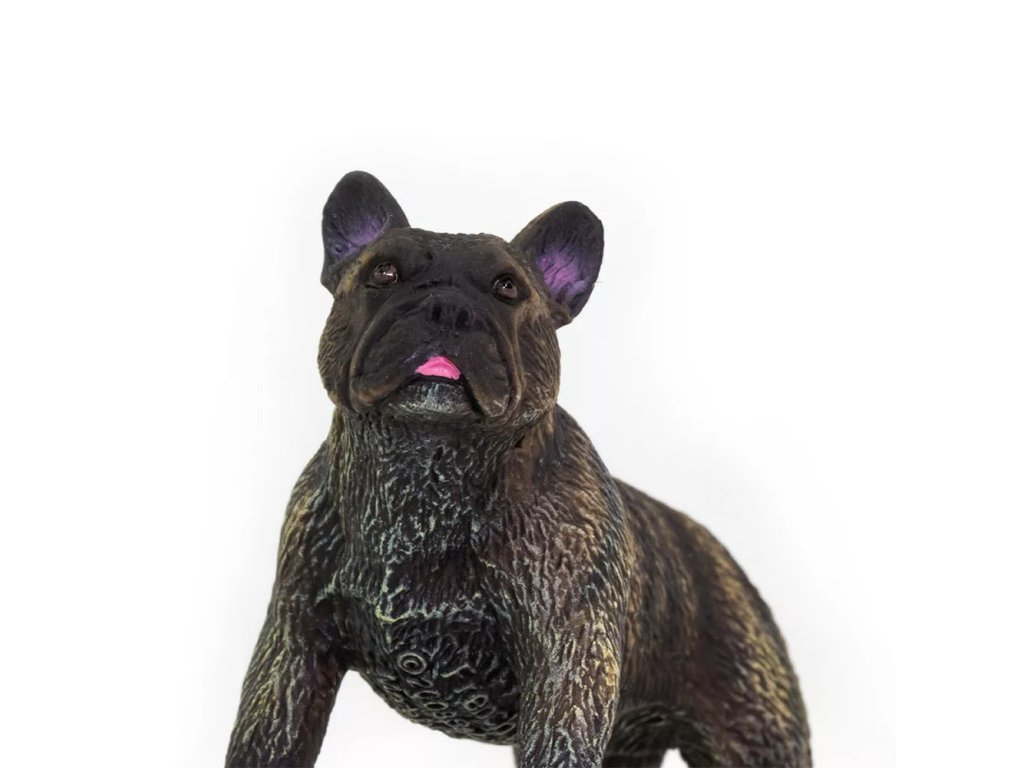 Podrobno izdelana figura francoskega buldoga, ki prikazuje videz in osnovne značilnosti te majhne družabne pasme.