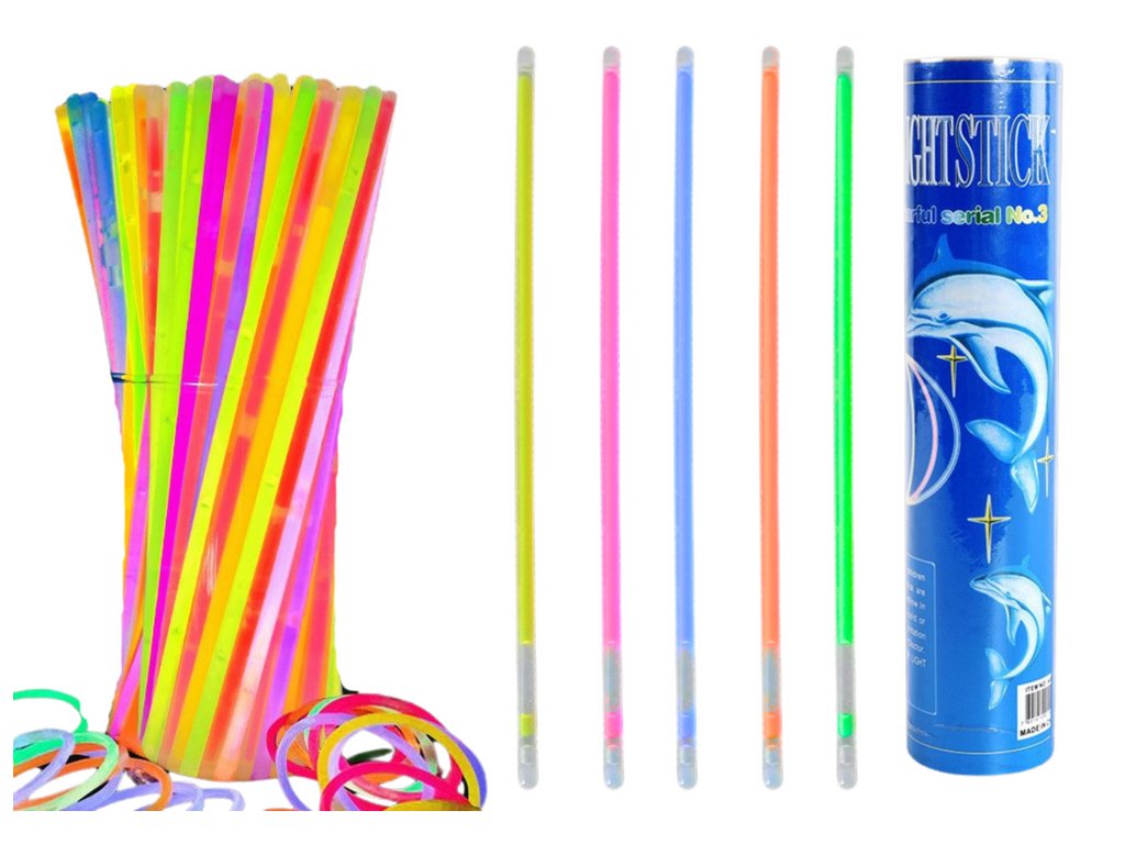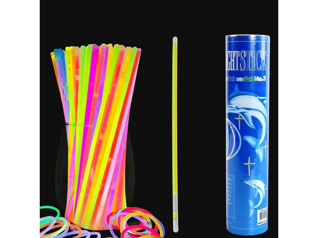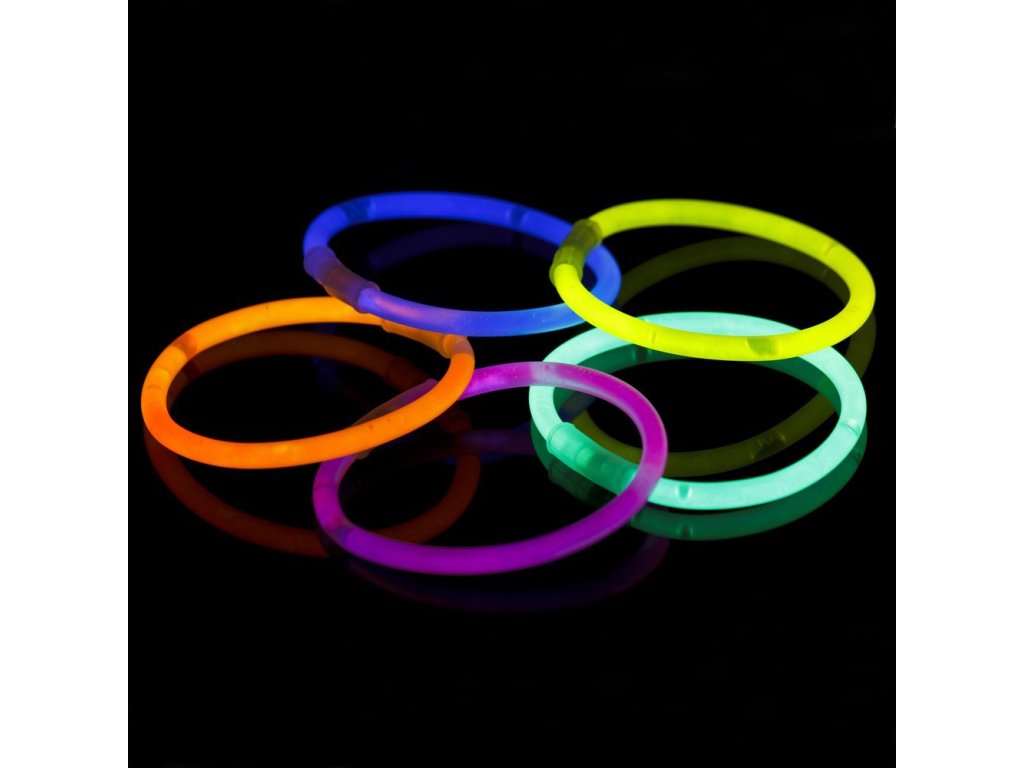 Set 100 raznobarvnih fluorescenčnih trakov. Ti trakovi se svetijo v temi in se lahko uporabljajo kot okras ali zapestnica.