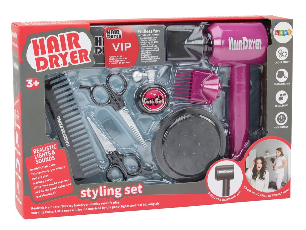 Glavni element seta je roza sušilec za lase, ki igrački dodaja čar in privlačnost. Sušilec je napajan z dvema baterijama, kar omogoča realistično simulacijo sušenja las, saj piha tok zraka. Poleg tega ima sušilec tri različne nastavke, ki omogočajo različne stile sušenja las, kar igri dodaja dodatno dimenzijo kreativnosti.
