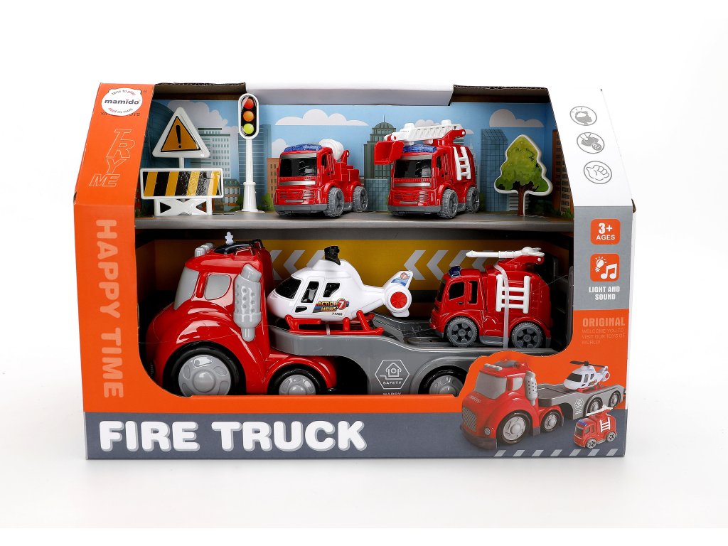 Velik komplet gasilskih vozil za male reševalce! Rdeči tovornjak s prikolico prevaža helikopter in dve gasilski vozili, tako da lahko otroci enostavno simulirajo intervencije in akcijske reševalne operacije. Igra je dopolnjena s svetlobnimi in zvočnimi efekti, ki še dodatno popestrijo zabavo.