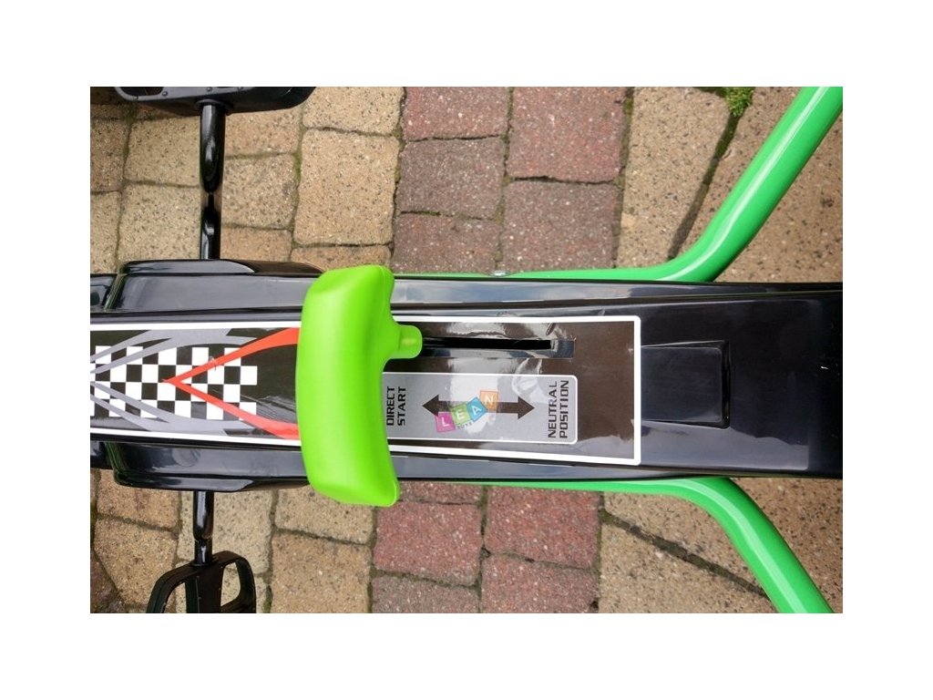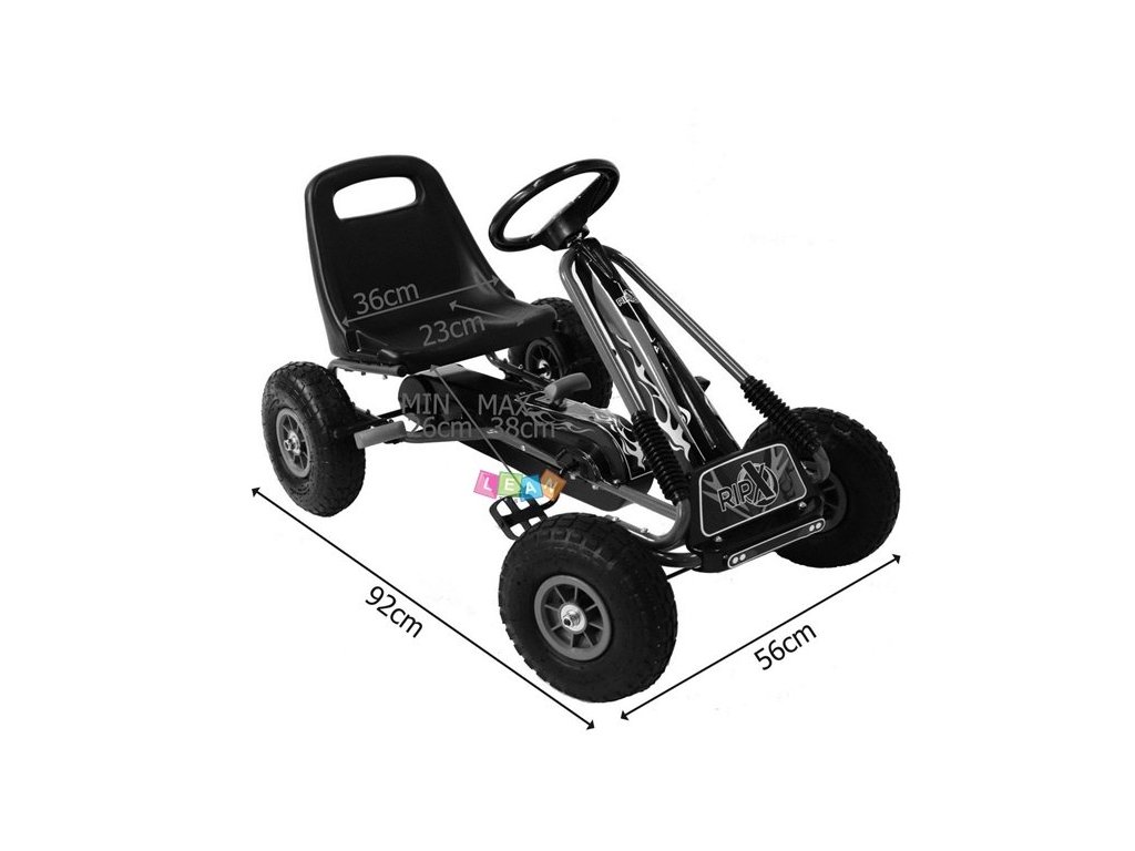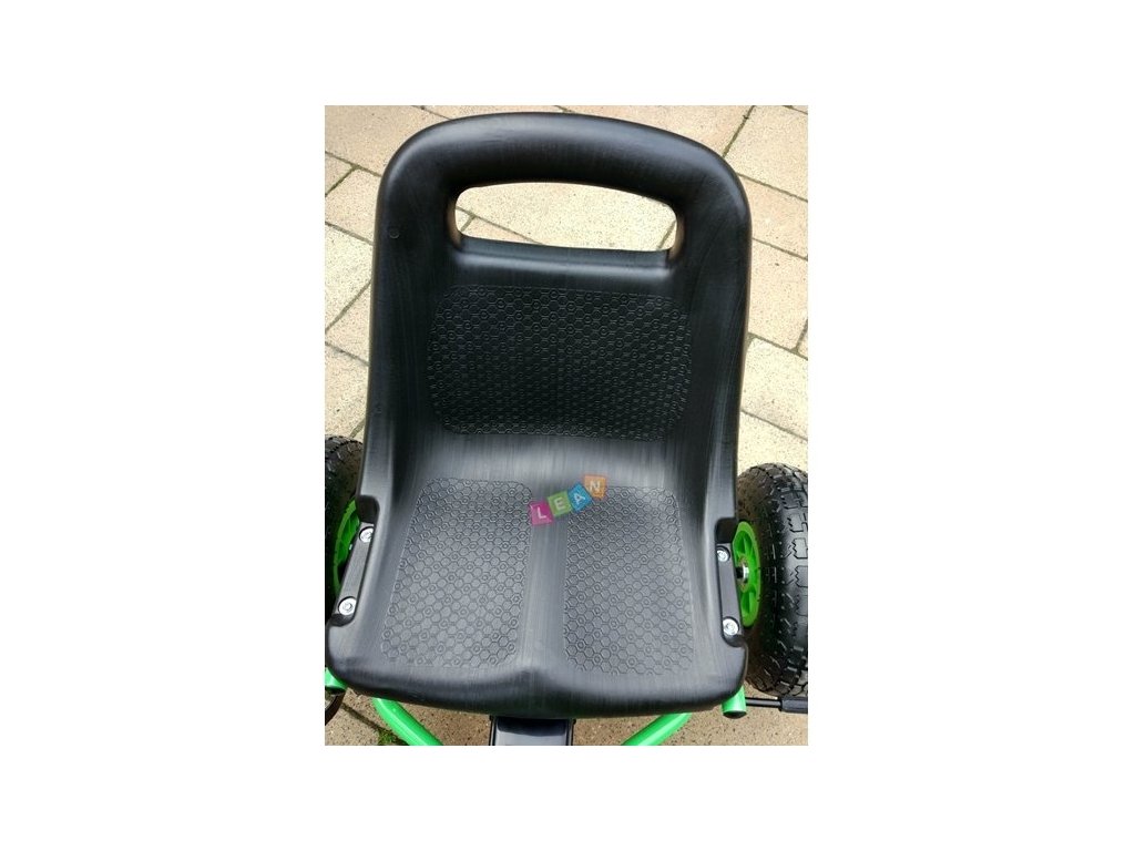 Otroški Go-kart na pedala z napihljivimi kolesi A-15 zelen je varen in udoben. Ima posebej zasnovan okvir in edinstven dizajn. Predvsem ima napihljiva gumijasta kolesa, ki omogočajo udobnejšo vožnjo. Go-kart je opremljen z ročno zavoro na dveh kolesih in nastavljivim sedežem na 3 nivojih.