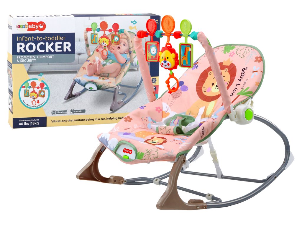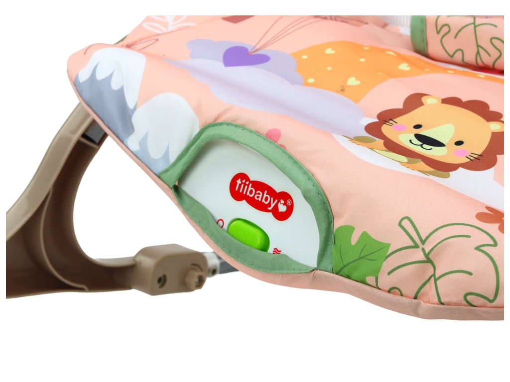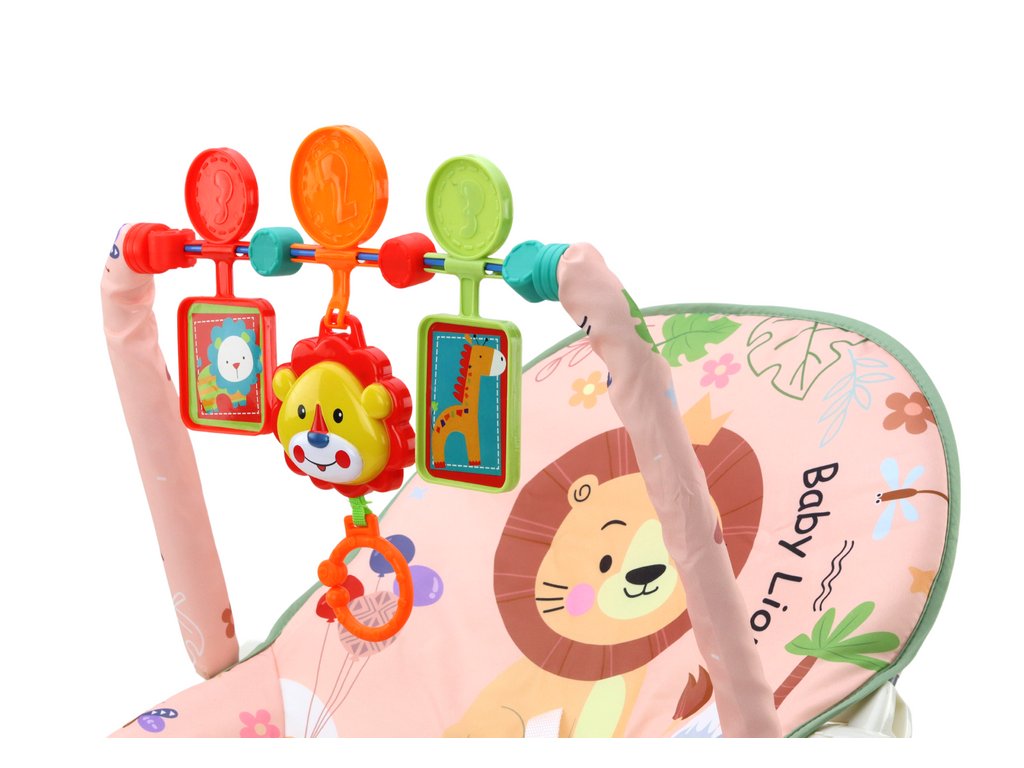 Rožnati prevleka gugalnega stola je okrašena z ljubkim motivom leva in različnih hroščkov ter rastlin, kar vsak trenutek preživet v njem napolni z avanturo in veseljem. Stolček je dopolnjen z lokom z vrtljivimi živalicami: levom in žirafo. Z vlečenjem oranžnega obročka, pritrjenega na leva, se začnejo predvajati vesele melodije, kar dodatno spodbuja otroka k interakciji in odkrivanju.