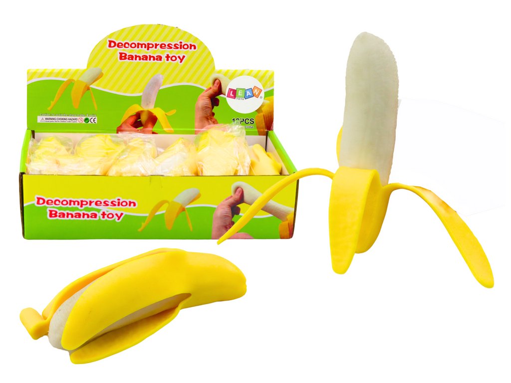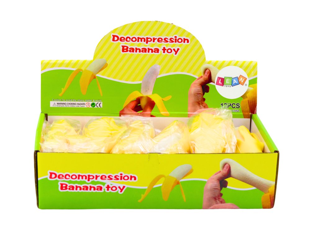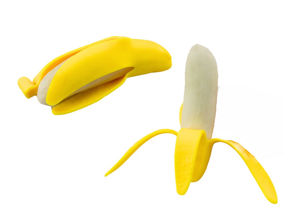 Rumena lupina, odprta na koncu, razkriva svetlo meso banane, ki ga je mogoče stiskati, gnesti in raztezati. Material, iz katerega je igrača narejena, je izjemno raztegljiv in odporen, kar omogoča, da se igrača povrne v prvotno obliko tudi po intenzivni uporabi.