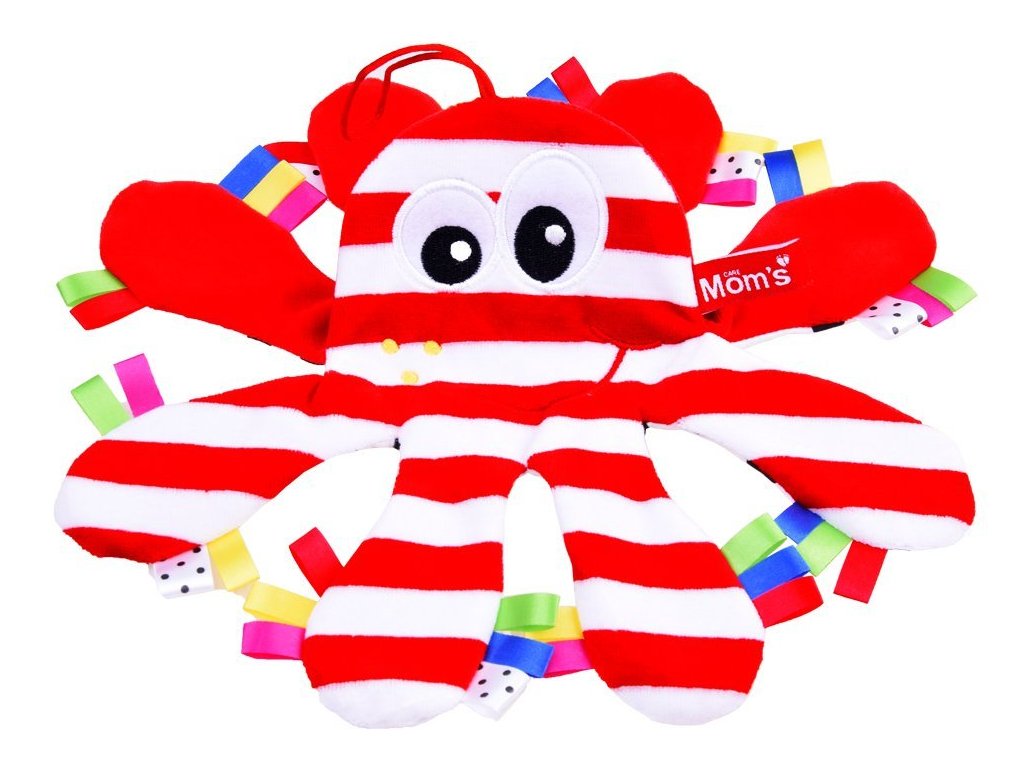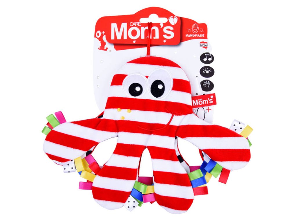 Otrok še ne razpoznava barv, zato je dobro izbrati igrače v kontrastnih barvah in geometrijskih vzorcih. Glavna značilnost te mehke igrače so izrazite belo-rdeče črte in črne pike na belem ozadju. Lepo izdelana plišasta igrača je narejena samo iz certificiranih materialov. Viseči trak omogoča enostavno namestitev hobotnice na okvir posteljice.