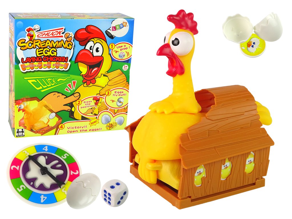 Čustva rastejo z vsakim nadaljnjim pritiskom piskajoče kokoške ! Kdo ve, če ne bo ravno v tem trenutku kokoš skočila in izstrelila zneseno jajce v zrak ? Bodite previdni - kdor ujame jajce, dobi točko. Mislimo, da je to igra polna smeha , napetosti in pozitivnih čustev. Primerna je tako za majhne otroke kot za starejše družinske člane, željne zabave.