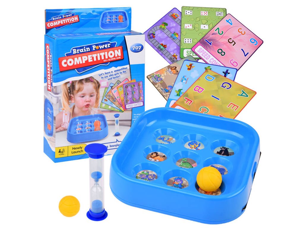 Pred začetkom igre je potrebno izbrati eno izmed igralnih kart in jo vstaviti v osnovo. Skozi devet odprtin je jasno vidna barvna grafika. Na igralnih kartah najdete številke in črke, ki so prikazane na različne načine. Žogico postavimo na prvo polje na primer s črko A ali številko 1. Naša naloga je pihati tako, da se žogica premika po osnovi v skladu z abecednim ali številčnim redom. Grafika je na igralnem polju razpršena, zato je treba natančno načrtovati, s kakšno močjo pihniti v žogico, kar ni čisto preprosto! Če naredite napako ali žogica pade na napačno polje, jo morate vrniti nazaj na začetek.Da bo igra še bolj napeta, lahko uporabite peščeno uro ali enostavno merite čas. Tekmovanje se lahko začne!
