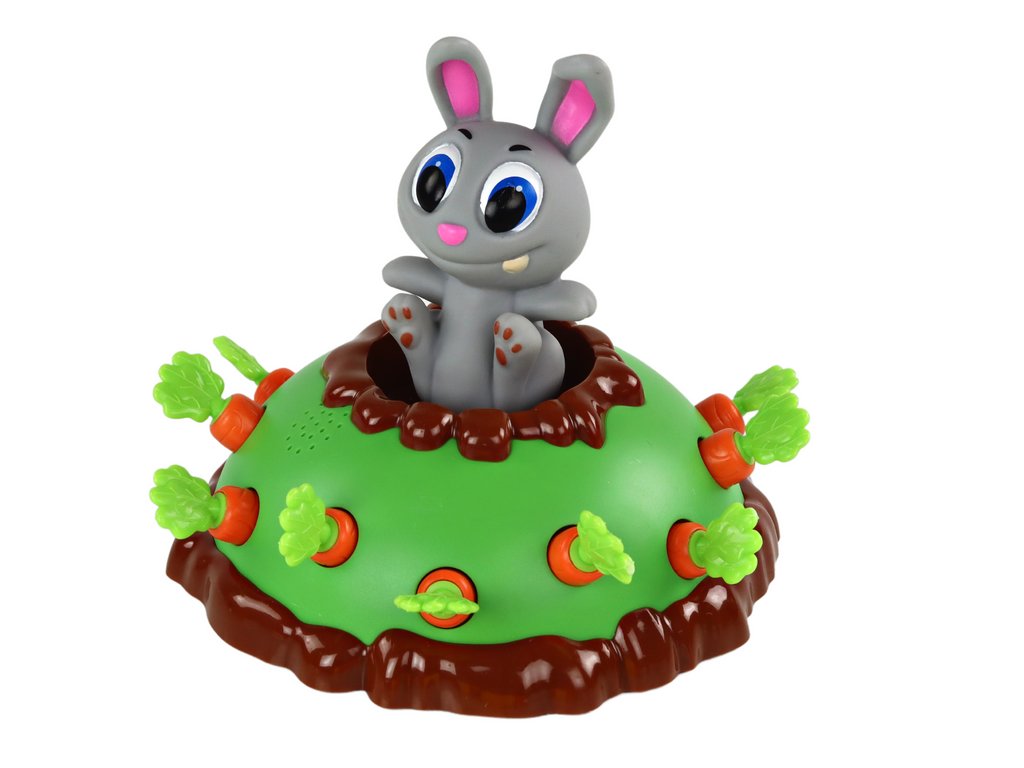 V tej barviti in zabavni igri lahko vaš otrok uživa v interaktivnih elementih in odlični zabavi. Osrednji element je gomila z odprtinami, ki ne le da predvaja veselo glasbo in utripajoče luči, temveč tudi ponuja akcijski prostor za majhnega zajčka, ki se skriva znotraj in je pripravljen skočiti.