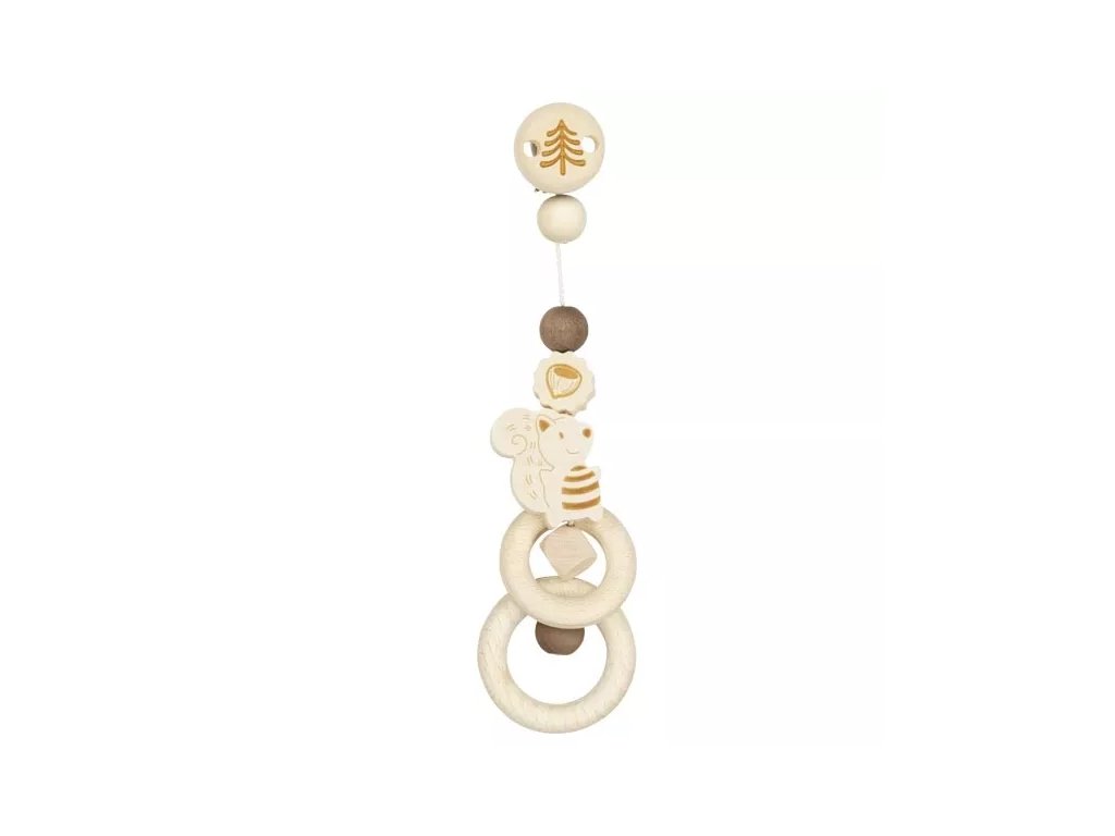 Praktična viseča igrača z leseno veverico in sponko za pritrditev na voziček ali avtosedež. Vsebuje več igralnih elementov, razporejenih tako, da spodbujajo otroka k igri in raziskovanju.