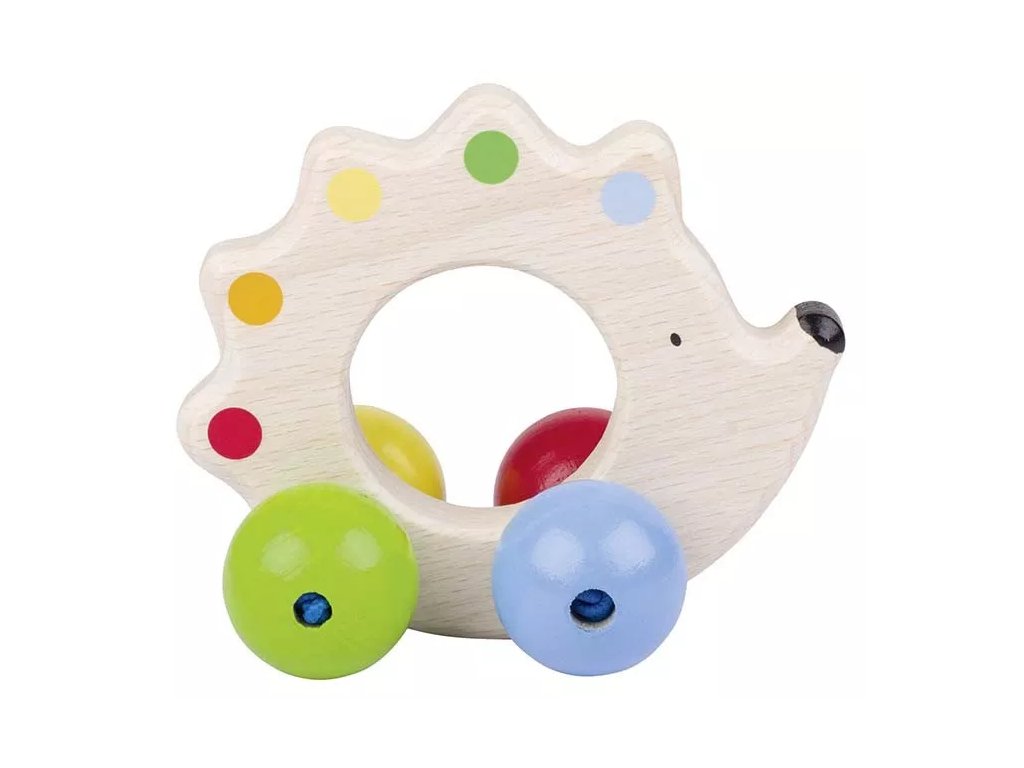 Lesena rožljica v obliki ježka na kolesih velikosti 8,5 cm. Primerno od prvih mesecev za vadbo prijemanja in senzoričnega zaznavanja.