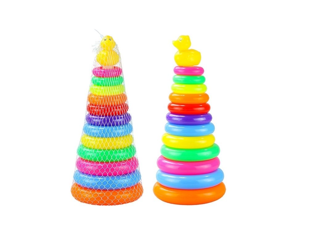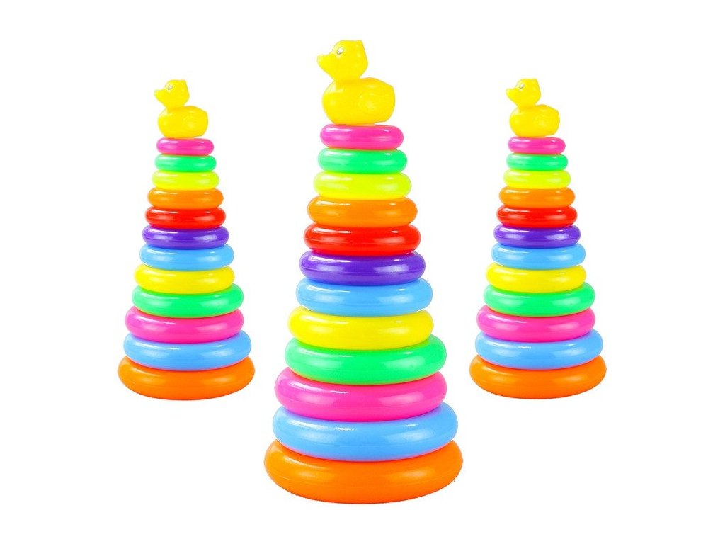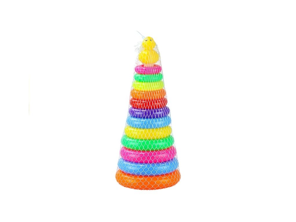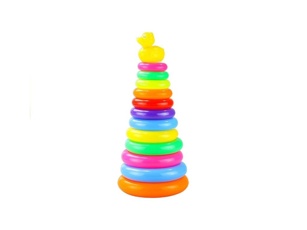 Barvita piramida z račko spodbuja motorične sposobnosti, koncentracijo otroka in ročne spretnosti. S to igračo se bo otrok naučil prepoznavati velikost predmetov in barve.