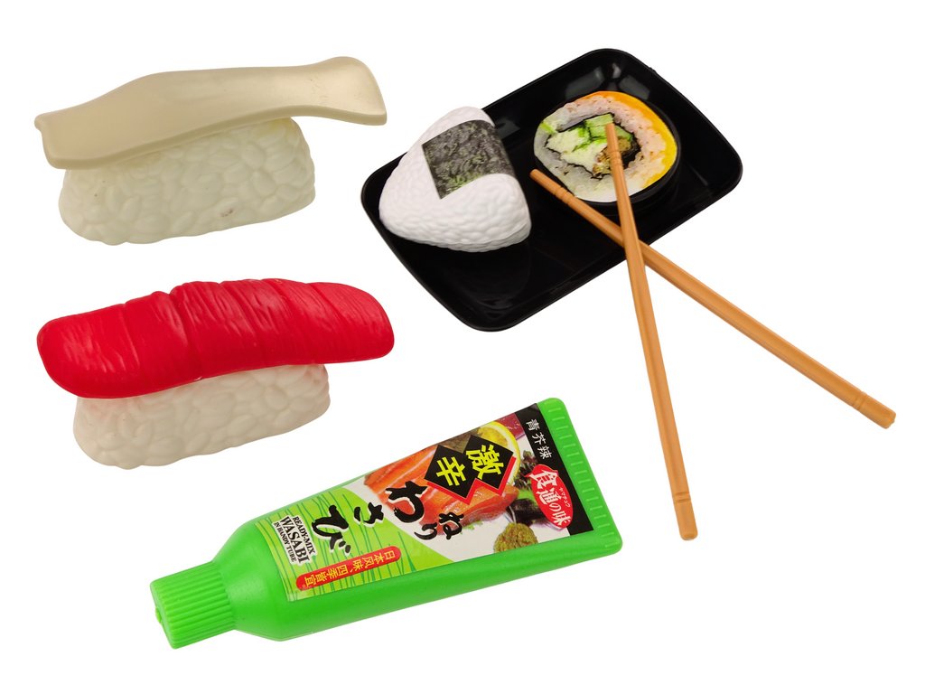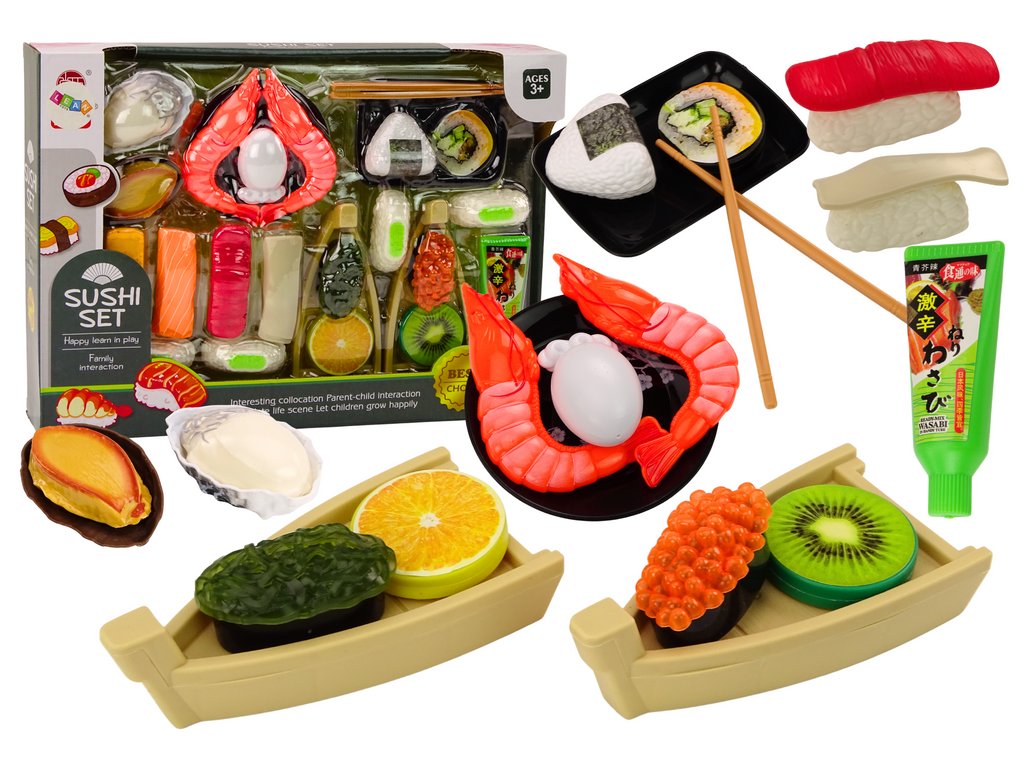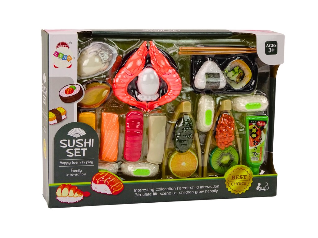 Igralni komplet za otroke, ki jih popelje v čarobni svet priprave in postrežbe okusnega sushija. Komplet vsebuje različne sestavine, potrebne za pripravo slastnega sushija. Med njimi so kozice, losos, wasabi, riž, nori alge in palčke za sushi.
