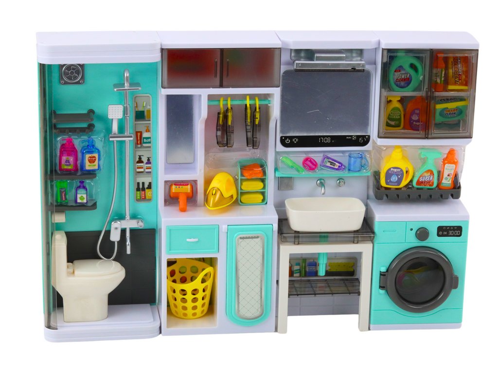 Set vsebuje tuš in stranišče, realistično izdelano s prozornimi vrati in majhno stranišče s premičnim pokrovom, idealno za igranje prizorov, povezanih z dnevnimi higienskimi rituali. Umivalnik z ogledalom je stilsko oblikovan, z vgrajenim ogledalom in poličko za toaletne potrebščine, kar otroke nauči skrbi za čistočo in red v kopalnici. Pralni stroj z omarico vključuje prikupen pralni stroj z gibljivimi deli in omarico za pralna sredstva in brisače, ki spodbuja učenje o pranju in organiziranju oblačil. Likalna deska in polica je praktičen element z mini likalnikom in poličkami za potrebne pripomočke, primeren za učenje likanja in organiziranje prostora.