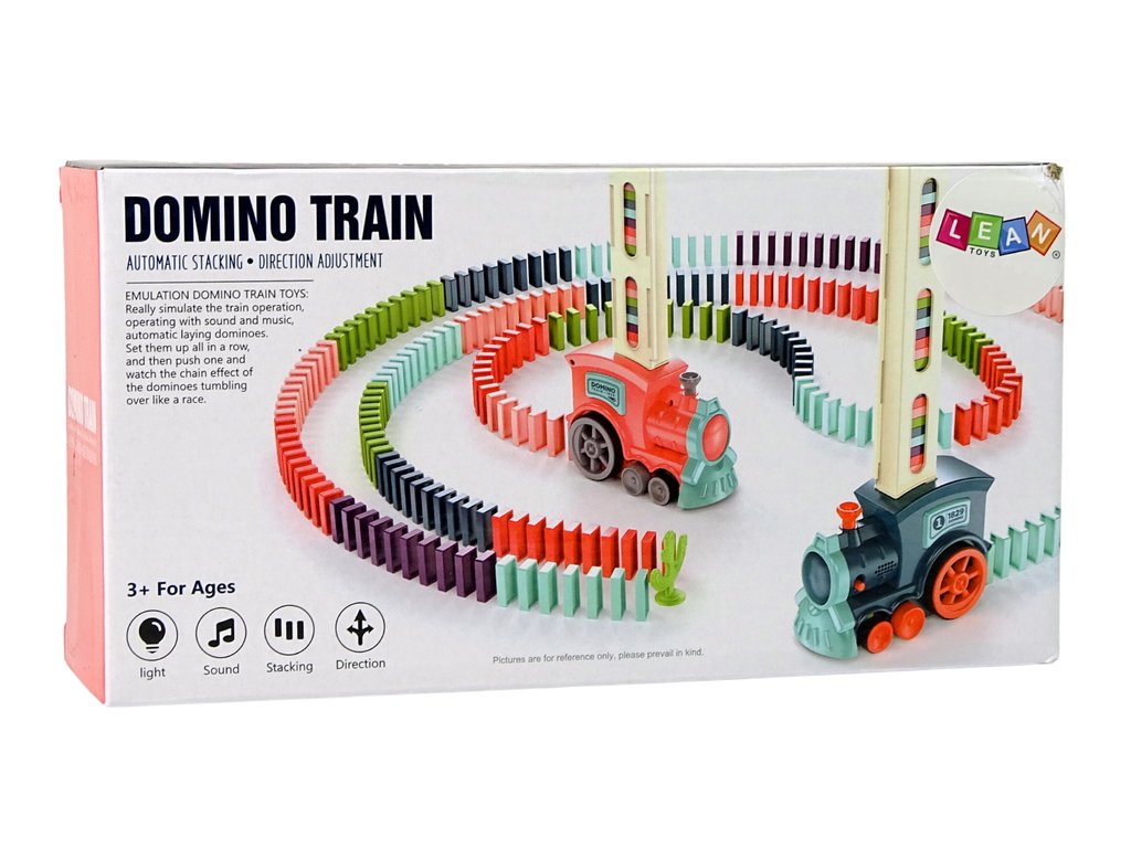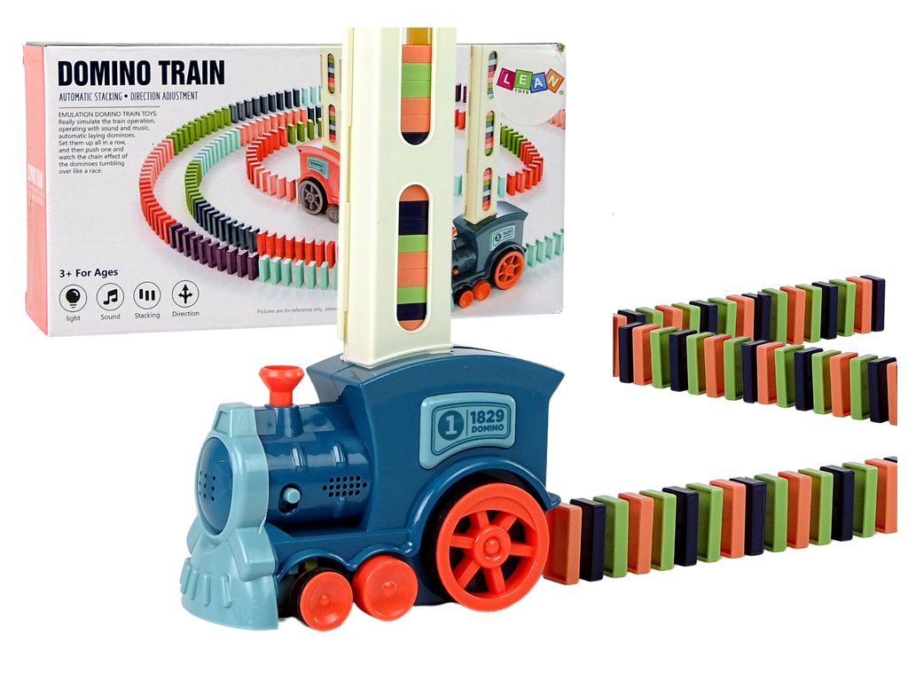 Barvita lokomotiva postavlja vrste dominovih kock, ki jih lahko čudovito podrete, ena za drugo se bodo kocke sesule. Dovolj je napolniti dozirnik, ki je del kompleta, pritisniti gumb in lokomotiva se bo začela premikati naprej, za sabo pa bo puščala zložene dominove kocke. Med igro vlak oddaja zvok. Lokomotivo lahko usmerjate z obračanjem dimnika na sprednjem delu, ki služi kot volan. Postavlja lahko dolge vrste domin s zavoji.