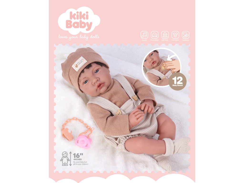 Lutka ima mehko tekstilno telo in podrobno izdelano glavo iz mehkega plastika, ki spominja na pravo dojenčkovo kožo. Idealen je za objemanje in crkljanje, kar spodbuja razvoj empatije in fino motoriko pri otrocih. Del kompleta so tudi dudo in roza zapestnica, ki dopolnjuje avtentičen videz lutke in omogoča otrokom igranje v različnih situacijah.