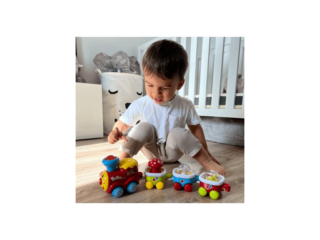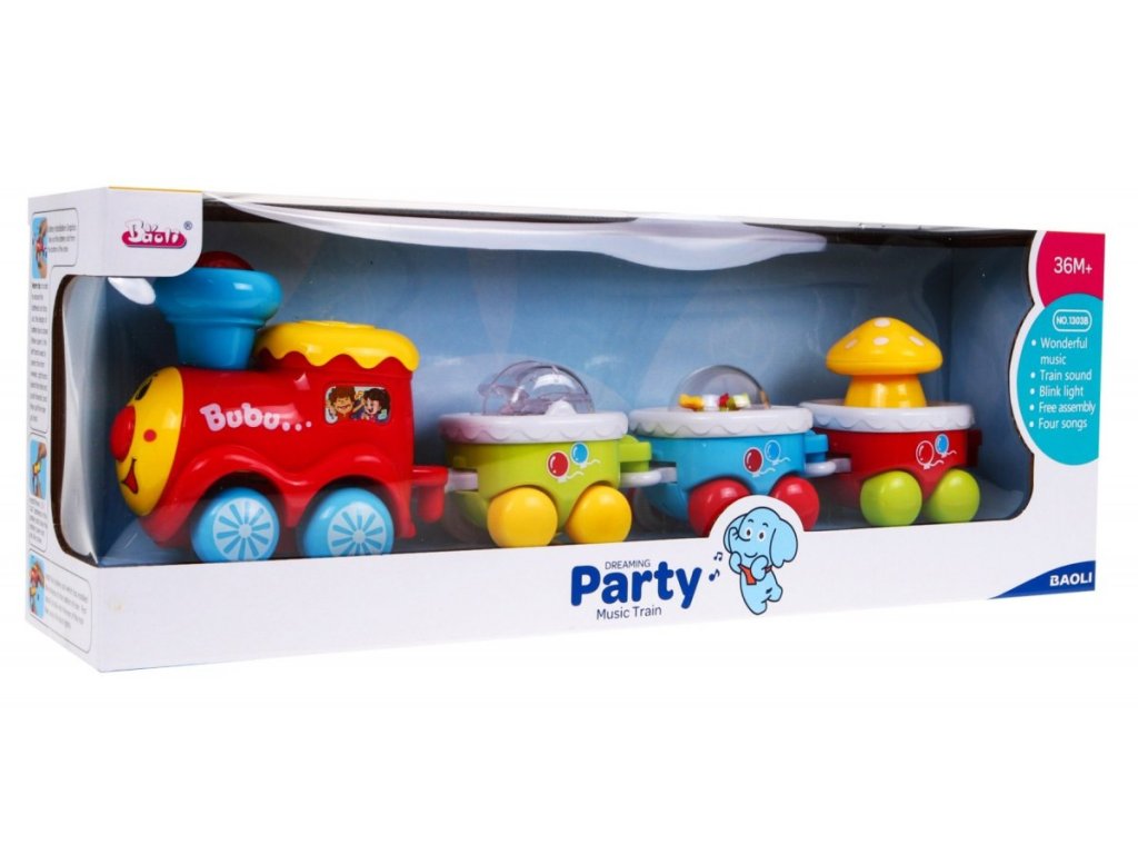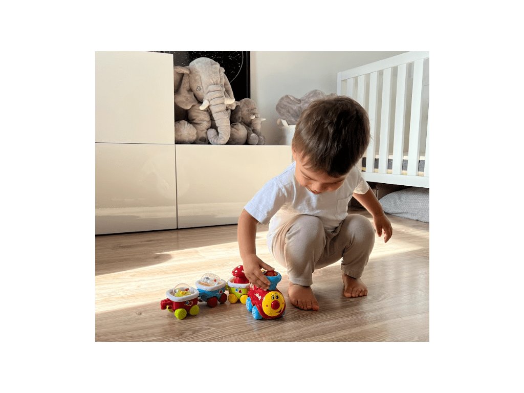 Interaktivni vlak z zvoki bo razveselil vsakega otroka, ki obožuje vlake. Veseli vlak v gibanju vas bo prijetno presenetil. Podajte se na barvito potovanje ob spremljavi prijetnih melodij. Vsak izmed treh vagonov ima svojo funkcijo, najdemo tu vrtljivo muhovino, premikajoče se barvite rožice in ropotuljico z barvnimi kroglicami. Poleg tega bo zabavo popestril barvno utripajoči dimnik, melodije in zvok delujoče lokomotive. Lokomotivo z vagoni lahko preprosto povežemo.