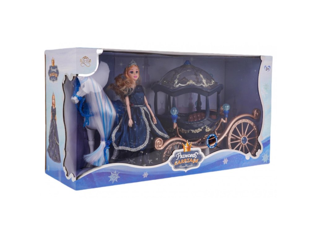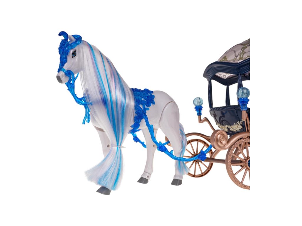 Komplet lutke, konja in kočije s svetlobnim in zvočnim učinkom za otroke od 3 let . Komplet vam omogoča, da se popeljete v svet čarovnije. Konj se premika naprej in spušča zvoke kot prava žival. Voziček je osvetljen z utripajočimi lučmi (modro in rdeče). Punčka ima gibljive roke in noge, čudovito maturantsko obleko in dolge lase.