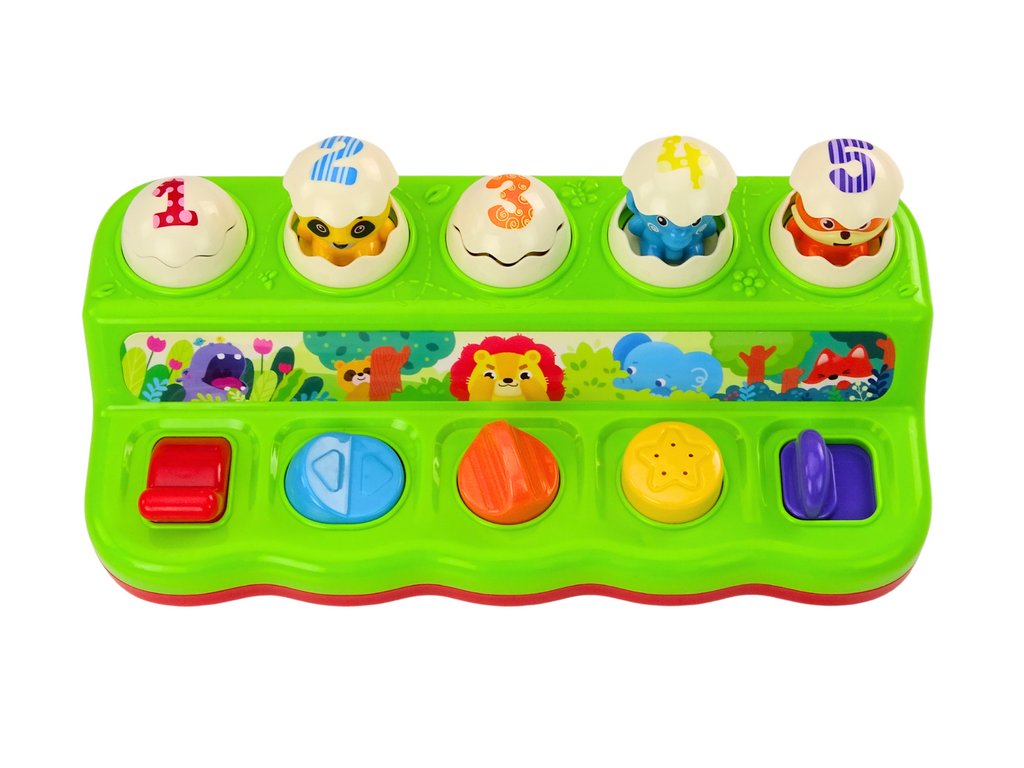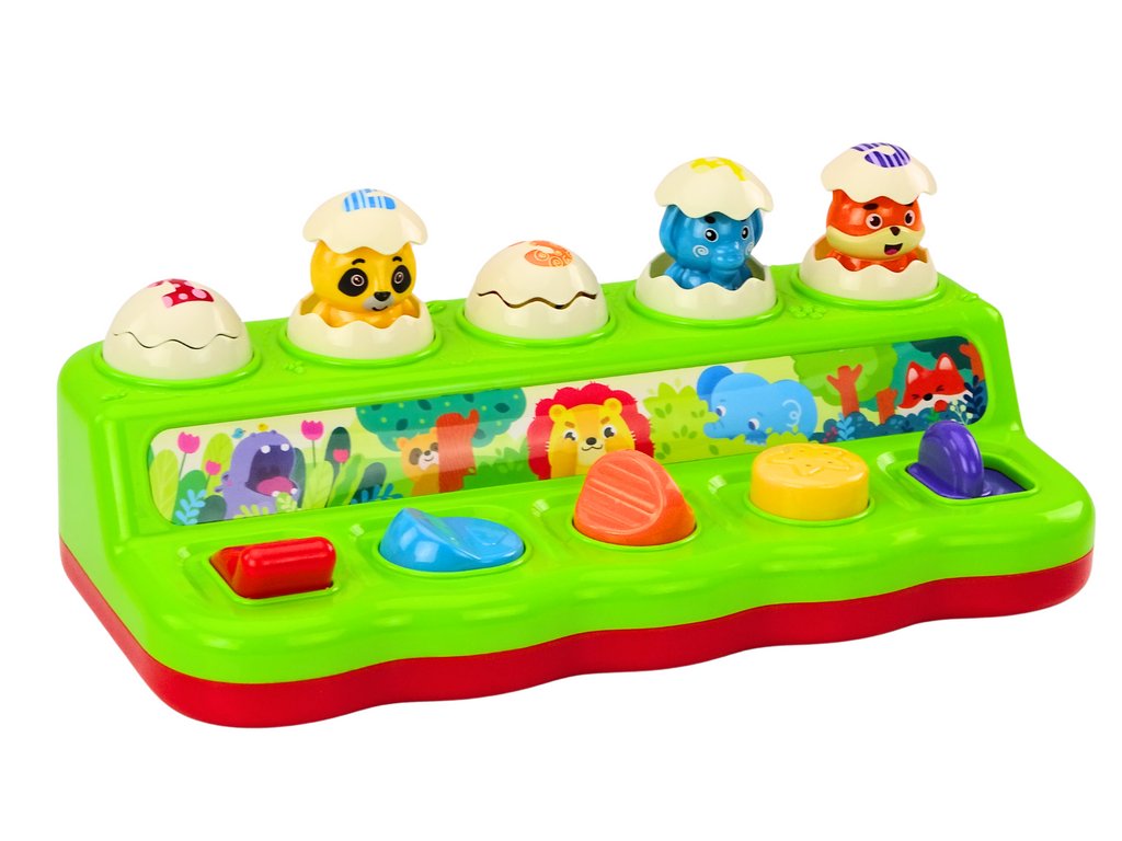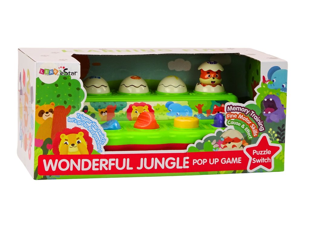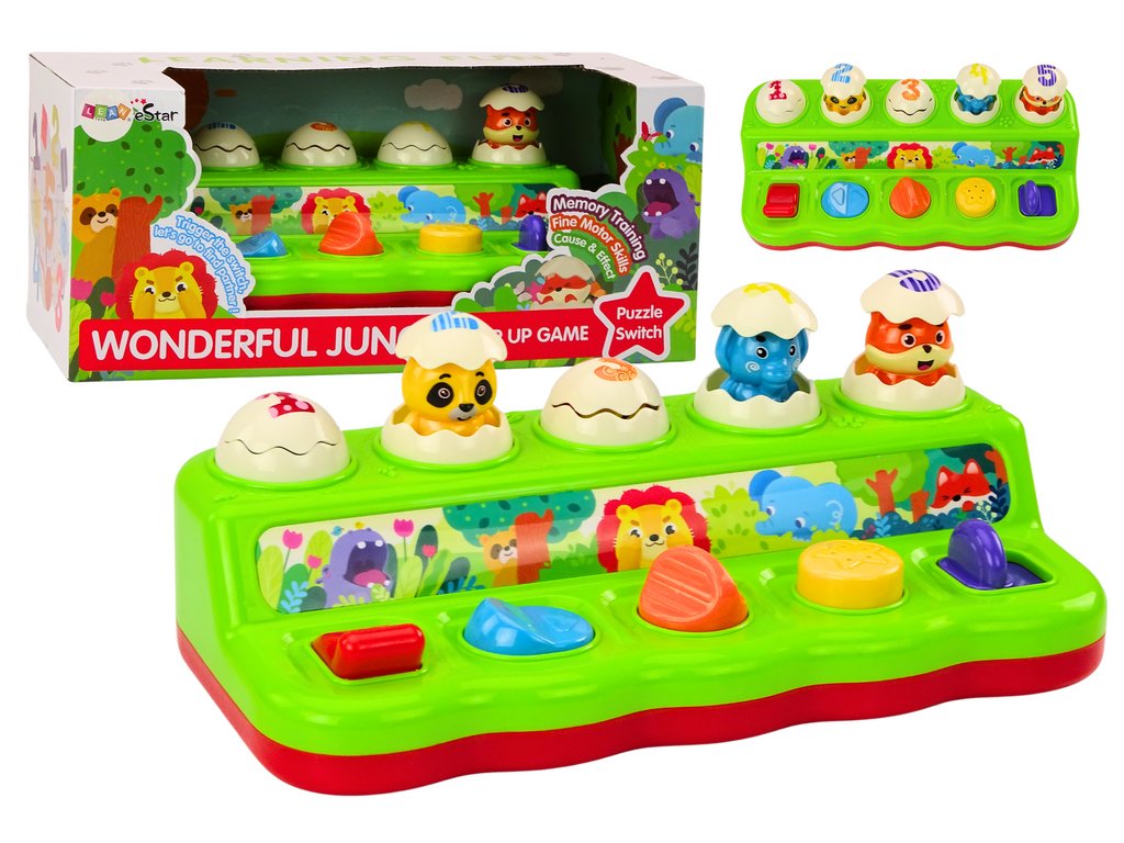 Ta barvita in interaktivna igrača Pop Up je čudovita igrača, ki bo navdušila vsakega otroka. Igrača je sestavljena iz petih oštevilčenih jajčkov z edinstvenimi vzorci na vsakem. Pod vsakim jajčkom je gumb, ki po pritisku, premiku ali obratu povzroči, da izskoči eno od petih ljubkih živali: hipopotam, panda, lev, slon in lisica. Vsak gumb ima drugačno barvo, kar pomaga pri učenju prepoznavanja barv. Gumbe je treba premakniti, povleči ali zasukati.