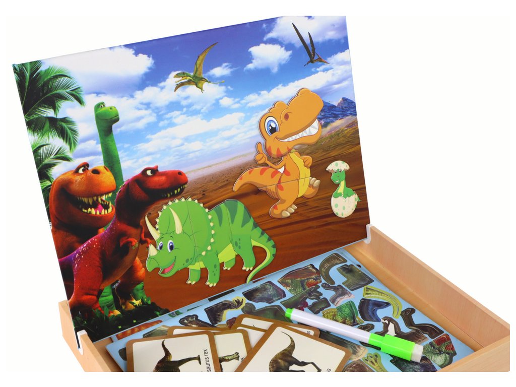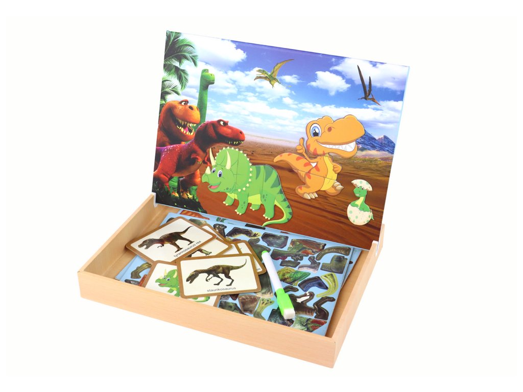 Na pokrovu škatle je prikazana prazgodovinska pokrajina, kjer si otroci lahko ustvarjajo lastne zgodbe. Druga stran plošče služi tudi kot risalna površina s priloženim flomastrom, kar otrokom omogoča umetniško izražanje.